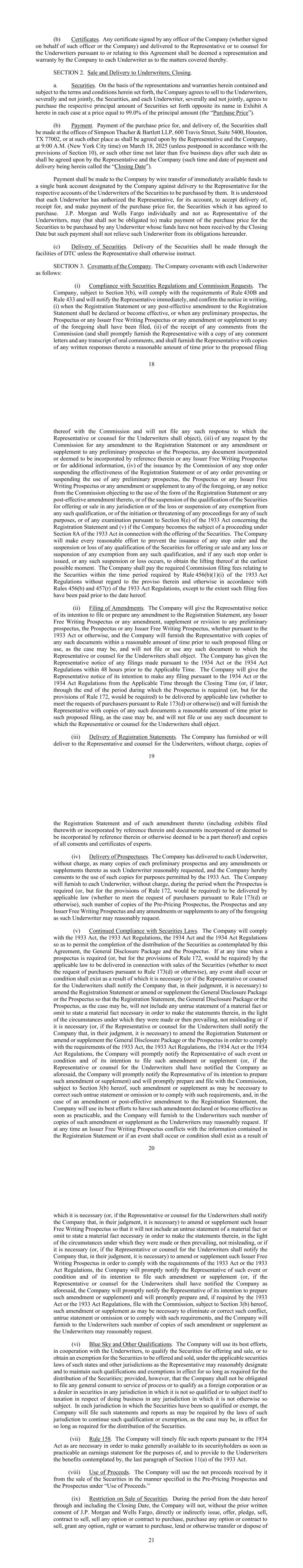 18 (b) Certificates. Any certificate signed by any officer of the Company (whether signed on behalf of such officer or the Company) and delivered to the Representative or to counsel for the Underwriters pursuant to or relating to this Agreement shall be deemed a representation and warranty by the Company to each Underwriter as to the matters covered thereby. SECTION 2. Sale and Delivery to Underwriters; Closing. a. Securities. On the basis of the representations and warranties herein contained and subject to the terms and conditions herein set forth, the Company agrees to sell to the Underwriters, severally and not jointly, the Securities, and each Underwriter, severally and not jointly, agrees to purchase the respective principal amount of Securities set forth opposite its name in Exhibit A hereto in each case at a price equal to 99.0% of the principal amount (the “Purchase Price”). (b) Payment. Payment of the purchase price for, and delivery of, the Securities shall be made at the offices of Simpson Thacher & Bartlett LLP, 600 Travis Street, Suite 5400, Houston, TX 77002, or at such other place as shall be agreed upon by the Representative and the Company, at 9:00 A.M. (New York City time) on March 18, 2025 (unless postponed in accordance with the provisions of Section 10), or such other time not later than five business days after such date as shall be agreed upon by the Representative and the Company (such time and date of payment and delivery being herein called the “Closing Date”). Payment shall be made to the Company by wire transfer of immediately available funds to a single bank account designated by the Company against delivery to the Representative for the respective accounts of the Underwriters of the Securities to be purchased by them. It is understood that each Underwriter has authorized the Representative, for its account, to accept delivery of, receipt for, and make payment of the purchase price for, the Securities which it has agreed to purchase. J.P. Morgan and Wells Fargo individually and not as Representative of the Underwriters, may (but shall not be obligated to) make payment of the purchase price for the Securities to be purchased by any Underwriter whose funds have not been received by the Closing Date but such payment shall not relieve such Underwriter from its obligations hereunder. (c) Delivery of Securities. Delivery of the Securities shall be made through the facilities of DTC unless the Representative shall otherwise instruct. SECTION 3. Covenants of the Company. The Company covenants with each Underwriter as follows: (i) Compliance with Securities Regulations and Commission Requests. The Company, subject to Section 3(b), will comply with the requirements of Rule 430B and Rule 433 and will notify the Representative immediately, and confirm the notice in writing, (i) when the Registration Statement or any post-effective amendment to the Registration Statement shall be declared or become effective, or when any preliminary prospectus, the Prospectus or any Issuer Free Writing Prospectus or any amendment or supplement to any of the foregoing shall have been filed, (ii) of the receipt of any comments from the Commission (and shall promptly furnish the Representative with a copy of any comment letters and any transcript of oral comments, and shall furnish the Representative with copies of any written responses thereto a reasonable amount of time prior to the proposed filing 19 thereof with the Commission and will not file any such response to which the Representative or counsel for the Underwriters shall object), (iii) of any request by the Commission for any amendment to the Registration Statement or any amendment or supplement to any preliminary prospectus or the Prospectus, any document incorporated or deemed to be incorporated by reference therein or any Issuer Free Writing Prospectus or for additional information, (iv) of the issuance by the Commission of any stop order suspending the effectiveness of the Registration Statement or of any order preventing or suspending the use of any preliminary prospectus, the Prospectus or any Issuer Free Writing Prospectus or any amendment or supplement to any of the foregoing, or any notice from the Commission objecting to the use of the form of the Registration Statement or any post-effective amendment thereto, or of the suspension of the qualification of the Securities for offering or sale in any jurisdiction or of the loss or suspension of any exemption from any such qualification, or of the initiation or threatening of any proceedings for any of such purposes, or of any examination pursuant to Section 8(e) of the 1933 Act concerning the Registration Statement and (v) if the Company becomes the subject of a proceeding under Section 8A of the 1933 Act in connection with the offering of the Securities. The Company will make every reasonable effort to prevent the issuance of any stop order and the suspension or loss of any qualification of the Securities for offering or sale and any loss or suspension of any exemption from any such qualification, and if any such stop order is issued, or any such suspension or loss occurs, to obtain the lifting thereof at the earliest possible moment. The Company shall pay the required Commission filing fees relating to the Securities within the time period required by Rule 456(b)(1)(i) of the 1933 Act Regulations without regard to the proviso therein and otherwise in accordance with Rules 456(b) and 457(r) of the 1933 Act Regulations, except to the extent such filing fees have been paid prior to the date hereof. (ii) Filing of Amendments. The Company will give the Representative notice of its intention to file or prepare any amendment to the Registration Statement, any Issuer Free Writing Prospectus or any amendment, supplement or revision to any preliminary prospectus, the Prospectus or any Issuer Free Writing Prospectus, whether pursuant to the 1933 Act or otherwise, and the Comp