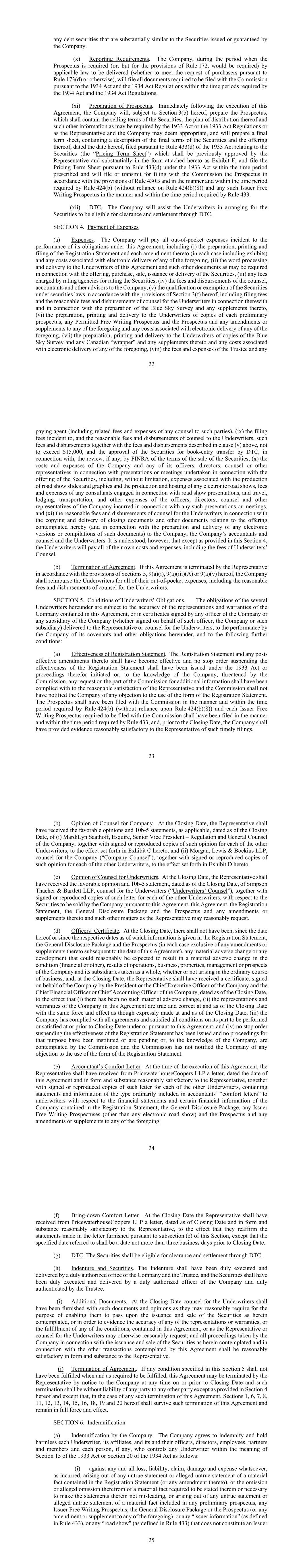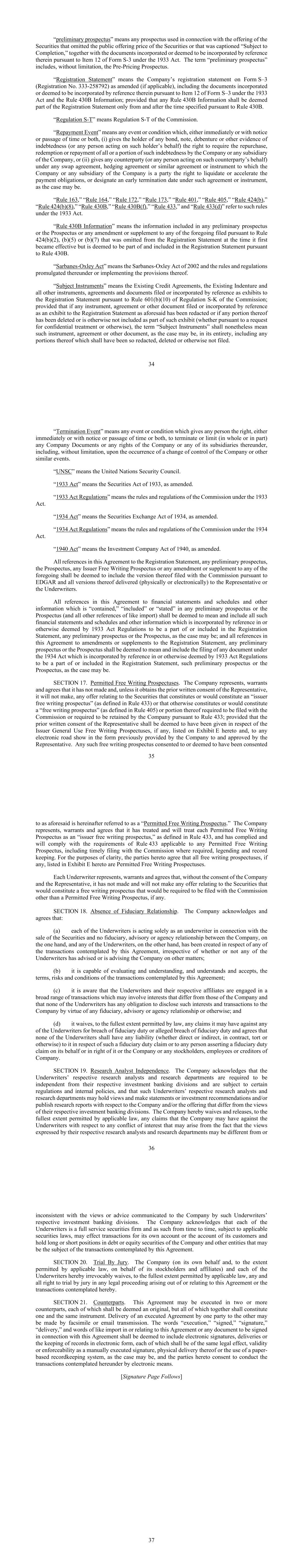34 “preliminary prospectus” means any prospectus used in connection with the offering of the Securities that omitted the public offering price of the Securities or that was captioned “Subject to Completion,” together with the documents incorporated or deemed to be incorporated by reference therein pursuant to Item 12 of Form S-3 under the 1933 Act. The term “preliminary prospectus” includes, without limitation, the Pre-Pricing Prospectus. “Registration Statement” means the Company’s registration statement on Form S–3 (Registration No. 333-258792) as amended (if applicable), including the documents incorporated or deemed to be incorporated by reference therein pursuant to Item 12 of Form S–3 under the 1933 Act and the Rule 430B Information; provided that any Rule 430B Information shall be deemed part of the Registration Statement only from and after the time specified pursuant to Rule 430B. “Regulation S-T” means Regulation S-T of the Commission. “Repayment Event” means any event or condition which, either immediately or with notice or passage of time or both, (i) gives the holder of any bond, note, debenture or other evidence of indebtedness (or any person acting on such holder’s behalf) the right to require the repurchase, redemption or repayment of all or a portion of such indebtedness by the Company or any subsidiary of the Company, or (ii) gives any counterparty (or any person acting on such counterparty’s behalf) under any swap agreement, hedging agreement or similar agreement or instrument to which the Company or any subsidiary of the Company is a party the right to liquidate or accelerate the payment obligations, or designate an early termination date under such agreement or instrument, as the case may be. “Rule 163,” “Rule 164,” “Rule 172,” “Rule 173,” “Rule 401,” “Rule 405,” “Rule 424(b),” “Rule 424(b)(8),” “Rule 430B,” “Rule 430B(f),” “Rule 433,” and “Rule 433(d)” refer to such rules under the 1933 Act. “Rule 430B Information” means the information included in any preliminary prospectus or the Prospectus or any amendment or supplement to any of the foregoing filed pursuant to Rule 424(b)(2), (b)(5) or (b)(7) that was omitted from the Registration Statement at the time it first became effective but is deemed to be part of and included in the Registration Statement pursuant to Rule 430B. “Sarbanes-Oxley Act” means the Sarbanes-Oxley Act of 2002 and the rules and regulations promulgated thereunder or implementing the provisions thereof. “Subject Instruments” means the Existing Credit Agreements, the Existing Indenture and all other instruments, agreements and documents filed or incorporated by reference as exhibits to the Registration Statement pursuant to Rule 601(b)(10) of Regulation S-K of the Commission; provided that if any instrument, agreement or other document filed or incorporated by reference as an exhibit to the Registration Statement as aforesaid has been redacted or if any portion thereof has been deleted or is otherwise not included as part of such exhibit (whether pursuant to a request for confidential treatment or otherwise), the term “Subject Instruments” shall nonetheless mean such instrument, agreement or other document, as the case may be, in its entirety, including any portions thereof which shall have been so redacted, deleted or otherwise not filed. 35 “Termination Event” means any event or condition which gives any person the right, either immediately or with notice or passage of time or both, to terminate or limit (in whole or in part) any Company Documents or any rights of the Company or any of its subsidiaries thereunder, including, without limitation, upon the occurrence of a change of control of the Company or other similar events. “UNSC” means the United Nations Security Council. “1933 Act” means the Securities Act of 1933, as amended. “1933 Act Regulations” means the rules and regulations of the Commission under the 1933 Act. “1934 Act” means the Securities Exchange Act of 1934, as amended. “1934 Act Regulations” means the rules and regulations of the Commission under the 1934 Act. “1940 Act” means the Investment Company Act of 1940, as amended. All references in this Agreement to the Registration Statement, any preliminary prospectus, the Prospectus, any Issuer Free Writing Prospectus or any amendment or supplement to any of the foregoing shall be deemed to include the version thereof filed with the Commission pursuant to EDGAR and all versions thereof delivered (physically or electronically) to the Representative or the Underwriters. All references in this Agreement to financial statements and schedules and other information which is “contained,” “included” or “stated” in any preliminary prospectus or the Prospectus (and all other references of like import) shall be deemed to mean and include all such financial statements and schedules and other information which is incorporated by reference in or otherwise deemed by 1933 Act Regulations to be a part of or included in the Registration Statement, any preliminary prospectus or the Prospectus, as the case may be; and all references in this Agreement to amendments or supplements to the Registration Statement, any preliminary prospectus or the Prospectus shall be deemed to mean and include the filing of any document under the 1934 Act which is incorporated by reference in or otherwise deemed by 1933 Act Regulations to be a part of or included in the Registration Statement, such preliminary prospectus or the Prospectus, as the case may be. SECTION 17. Permitted Free Writing Prospectuses. The Company represents, warrants and agrees that it has not made and, unless it obtains the prior written consent of the Representative, it will not make, any offer relating to the Securities that constitutes or would constitute an “issuer free writing prospectus” (as defined in Ru