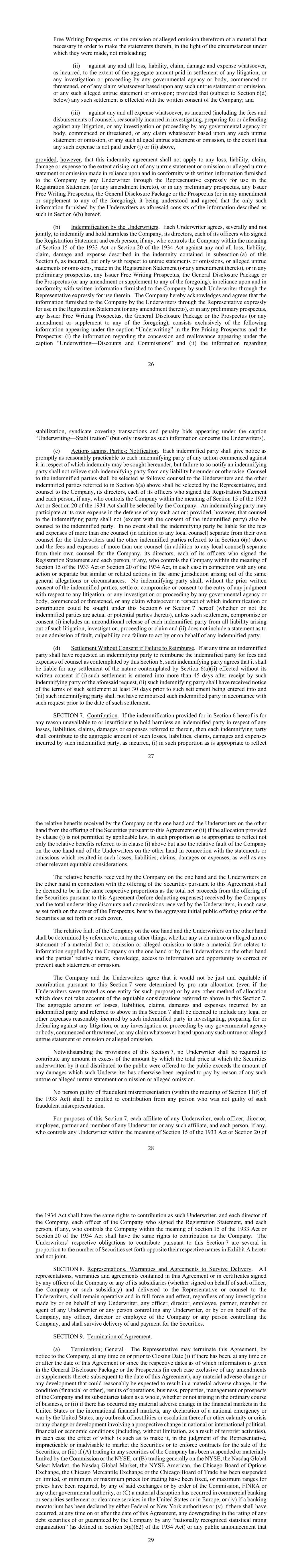 26 Free Writing Prospectus, or the omission or alleged omission therefrom of a material fact necessary in order to make the statements therein, in the light of the circumstances under which they were made, not misleading; (ii) against any and all loss, liability, claim, damage and expense whatsoever, as incurred, to the extent of the aggregate amount paid in settlement of any litigation, or any investigation or proceeding by any governmental agency or body, commenced or threatened, or of any claim whatsoever based upon any such untrue statement or omission, or any such alleged untrue statement or omission; provided that (subject to Section 6(d) below) any such settlement is effected with the written consent of the Company; and (iii) against any and all expense whatsoever, as incurred (including the fees and disbursements of counsel), reasonably incurred in investigating, preparing for or defending against any litigation, or any investigation or proceeding by any governmental agency or body, commenced or threatened, or any claim whatsoever based upon any such untrue statement or omission, or any such alleged untrue statement or omission, to the extent that any such expense is not paid under (i) or (ii) above, provided, however, that this indemnity agreement shall not apply to any loss, liability, claim, damage or expense to the extent arising out of any untrue statement or omission or alleged untrue statement or omission made in reliance upon and in conformity with written information furnished to the Company by any Underwriter through the Representative expressly for use in the Registration Statement (or any amendment thereto), or in any preliminary prospectus, any Issuer Free Writing Prospectus, the General Disclosure Package or the Prospectus (or in any amendment or supplement to any of the foregoing), it being understood and agreed that the only such information furnished by the Underwriters as aforesaid consists of the information described as such in Section 6(b) hereof. (b) Indemnification by the Underwriters. Each Underwriter agrees, severally and not jointly, to indemnify and hold harmless the Company, its directors, each of its officers who signed the Registration Statement and each person, if any, who controls the Company within the meaning of Section 15 of the 1933 Act or Section 20 of the 1934 Act against any and all loss, liability, claim, damage and expense described in the indemnity contained in subsection (a) of this Section 6, as incurred, but only with respect to untrue statements or omissions, or alleged untrue statements or omissions, made in the Registration Statement (or any amendment thereto), or in any preliminary prospectus, any Issuer Free Writing Prospectus, the General Disclosure Package or the Prospectus (or any amendment or supplement to any of the foregoing), in reliance upon and in conformity with written information furnished to the Company by such Underwriter through the Representative expressly for use therein. The Company hereby acknowledges and agrees that the information furnished to the Company by the Underwriters through the Representative expressly for use in the Registration Statement (or any amendment thereto), or in any preliminary prospectus, any Issuer Free Writing Prospectus, the General Disclosure Package or the Prospectus (or any amendment or supplement to any of the foregoing), consists exclusively of the following information appearing under the caption “Underwriting” in the Pre-Pricing Prospectus and the Prospectus: (i) the information regarding the concession and reallowance appearing under the caption “Underwriting—Discounts and Commissions” and (ii) the information regarding 27 stabilization, syndicate covering transactions and penalty bids appearing under the caption “Underwriting—Stabilization” (but only insofar as such information concerns the Underwriters). (c) Actions against Parties; Notification. Each indemnified party shall give notice as promptly as reasonably practicable to each indemnifying party of any action commenced against it in respect of which indemnity may be sought hereunder, but failure to so notify an indemnifying party shall not relieve such indemnifying party from any liability hereunder or otherwise. Counsel to the indemnified parties shall be selected as follows: counsel to the Underwriters and the other indemnified parties referred to in Section 6(a) above shall be selected by the Representative, and counsel to the Company, its directors, each of its officers who signed the Registration Statement and each person, if any, who controls the Company within the meaning of Section 15 of the 1933 Act or Section 20 of the 1934 Act shall be selected by the Company. An indemnifying party may participate at its own expense in the defense of any such action; provided, however, that counsel to the indemnifying party shall not (except with the consent of the indemnified party) also be counsel to the indemnified party. In no event shall the indemnifying party be liable for the fees and expenses of more than one counsel (in addition to any local counsel) separate from their own counsel for the Underwriters and the other indemnified parties referred to in Section 6(a) above and the fees and expenses of more than one counsel (in addition to any local counsel) separate from their own counsel for the Company, its directors, each of its officers who signed the Registration Statement and each person, if any, who controls the Company within the meaning of Section 15 of the 1933 Act or Section 20 of the 1934 Act, in each case in connection with any one action or separate but similar or related actions in the same jurisdiction arising out of the same general allegations or circumstances. No indemnifying party shall, without the prior written consent of the indemnified parties, settle or compromise or consent to the entry of any judgment with respect to any litigation, or any investigation or proceeding by any govern