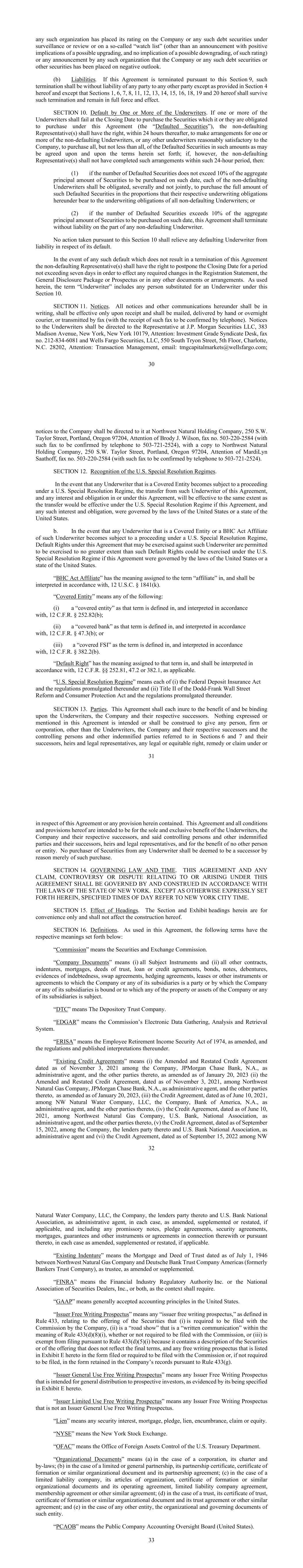 30 any such organization has placed its rating on the Company or any such debt securities under surveillance or review or on a so-called “watch list” (other than an announcement with positive implications of a possible upgrading, and no implication of a possible downgrading, of such rating) or any announcement by any such organization that the Company or any such debt securities or other securities has been placed on negative outlook. (b) Liabilities. If this Agreement is terminated pursuant to this Section 9, such termination shall be without liability of any party to any other party except as provided in Section 4 hereof and except that Sections 1, 6, 7, 8, 11, 12, 13, 14, 15, 16, 18, 19 and 20 hereof shall survive such termination and remain in full force and effect. SECTION 10. Default by One or More of the Underwriters. If one or more of the Underwriters shall fail at the Closing Date to purchase the Securities which it or they are obligated to purchase under this Agreement (the “Defaulted Securities”), the non-defaulting Representative(s) shall have the right, within 24 hours thereafter, to make arrangements for one or more of the non-defaulting Underwriters, or any other underwriters reasonably satisfactory to the Company, to purchase all, but not less than all, of the Defaulted Securities in such amounts as may be agreed upon and upon the terms herein set forth; if, however, the non-defaulting Representative(s) shall not have completed such arrangements within such 24-hour period, then: (1) if the number of Defaulted Securities does not exceed 10% of the aggregate principal amount of Securities to be purchased on such date, each of the non-defaulting Underwriters shall be obligated, severally and not jointly, to purchase the full amount of such Defaulted Securities in the proportions that their respective underwriting obligations hereunder bear to the underwriting obligations of all non-defaulting Underwriters; or (2) if the number of Defaulted Securities exceeds 10% of the aggregate principal amount of Securities to be purchased on such date, this Agreement shall terminate without liability on the part of any non-defaulting Underwriter. No action taken pursuant to this Section 10 shall relieve any defaulting Underwriter from liability in respect of its default. In the event of any such default which does not result in a termination of this Agreement the non-defaulting Representative(s) shall have the right to postpone the Closing Date for a period not exceeding seven days in order to effect any required changes in the Registration Statement, the General Disclosure Package or Prospectus or in any other documents or arrangements. As used herein, the term “Underwriter” includes any person substituted for an Underwriter under this Section 10. SECTION 11. Notices. All notices and other communications hereunder shall be in writing, shall be effective only upon receipt and shall be mailed, delivered by hand or overnight courier, or transmitted by fax (with the receipt of such fax to be confirmed by telephone). Notices to the Underwriters shall be directed to the Representative at J.P. Morgan Securities LLC, 383 Madison Avenue, New York, New York 10179, Attention: Investment Grade Syndicate Desk, fax no. 212-834-6081 and Wells Fargo Securities, LLC, 550 South Tryon Street, 5th Floor, Charlotte, N.C. 28202, Attention: Transaction Management, email: tmgcapitalmarkets@wellsfargo.com; 31 notices to the Company shall be directed to it at Northwest Natural Holding Company, 250 S.W. Taylor Street, Portland, Oregon 97204, Attention of Brody J. Wilson, fax no. 503-220-2584 (with such fax to be confirmed by telephone to 503-721-2524), with a copy to Northwest Natural Holding Company, 250 S.W. Taylor Street, Portland, Oregon 97204, Attention of MardiLyn Saathoff, fax no. 503-220-2584 (with such fax to be confirmed by telephone to 503-721-2524). SECTION 12. Recognition of the U.S. Special Resolution Regimes. In the event that any Underwriter that is a Covered Entity becomes subject to a proceeding under a U.S. Special Resolution Regime, the transfer from such Underwriter of this Agreement, and any interest and obligation in or under this Agreement, will be effective to the same extent as the transfer would be effective under the U.S. Special Resolution Regime if this Agreement, and any such interest and obligation, were governed by the laws of the United States or a state of the United States. b. In the event that any Underwriter that is a Covered Entity or a BHC Act Affiliate of such Underwriter becomes subject to a proceeding under a U.S. Special Resolution Regime, Default Rights under this Agreement that may be exercised against such Underwriter are permitted to be exercised to no greater extent than such Default Rights could be exercised under the U.S. Special Resolution Regime if this Agreement were governed by the laws of the United States or a state of the United States. “BHC Act Affiliate” has the meaning assigned to the term “affiliate” in, and shall be interpreted in accordance with, 12 U.S.C. § 1841(k). “Covered Entity” means any of the following: (i) a “covered entity” as that term is defined in, and interpreted in accordance with, 12 C.F.R. § 252.82(b); (ii) a “covered bank” as that term is defined in, and interpreted in accordance with, 12 C.F.R. § 47.3(b); or (iii) a “covered FSI” as the term is defined in, and interpreted in accordance with, 12 C.F.R. § 382.2(b). “Default Right” has the meaning assigned to that term in, and shall be interpreted in accordance with, 12 C.F.R. §§ 252.81, 47.2 or 382.1, as applicable. “U.S. Special Resolution Regime” means each of (i) the Federal Deposit Insurance Act and the regulations promulgated thereunder and (ii) Title II of the Dodd-Frank Wall Street Reform and Consumer Protection Act and the regulations promulgated thereunder. SECTION 13. Parties. This Agreement shall each inure to the benefit of