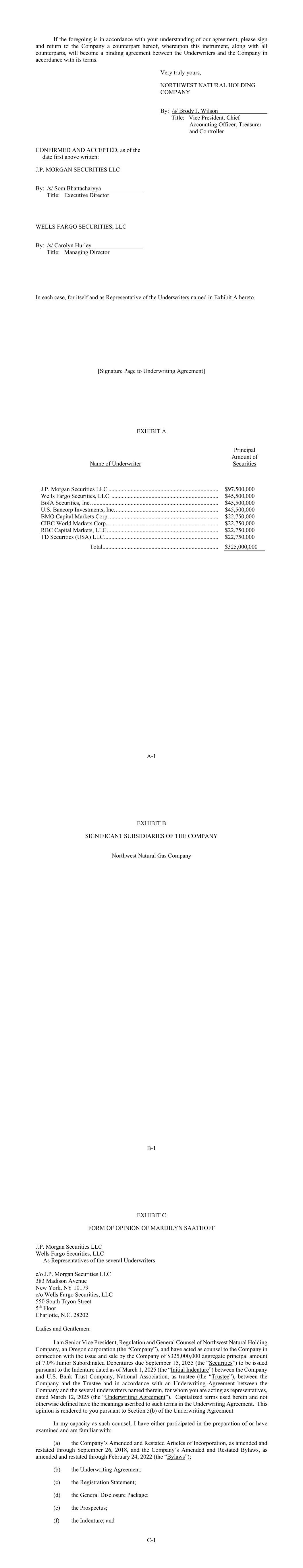 [Signature Page to Underwriting Agreement] If the foregoing is in accordance with your understanding of our agreement, please sign and return to the Company a counterpart hereof, whereupon this instrument, along with all counterparts, will become a binding agreement between the Underwriters and the Company in accordance with its terms. Very truly yours, NORTHWEST NATURAL HOLDING COMPANY By: /s/ Brody J. Wilson Title: Vice President, Chief Accounting Officer, Treasurer and Controller CONFIRMED AND ACCEPTED, as of the date first above written: J.P. MORGAN SECURITIES LLC By: /s/ Som Bhattacharyya Title: Executive Director WELLS FARGO SECURITIES, LLC By: /s/ Carolyn Hurley Title: Managing Director In each case, for itself and as Representative of the Underwriters named in Exhibit A hereto. A-1 EXHIBIT A Name of Underwriter Principal Amount of Securities J.P. Morgan Securities LLC .......................................................................... $97,500,000 Wells Fargo Securities, LLC ........................................................................ $45,500,000 BofA Securities, Inc. ..................................................................................... $45,500,000 U.S. Bancorp Investments, Inc. ..................................................................... $45,500,000 BMO Capital Markets Corp. ......................................................................... $22,750,000 CIBC World Markets Corp. .......................................................................... $22,750,000 RBC Capital Markets, LLC ........................................................................... $22,750,000 TD Securities (USA) LLC ............................................................................. $22,750,000 Total .............................................................................. $325,000,000 B-1 EXHIBIT B SIGNIFICANT SUBSIDIARIES OF THE COMPANY Northwest Natural Gas Company C-1 EXHIBIT C FORM OF OPINION OF MARDILYN SAATHOFF J.P. Morgan Securities LLC Wells Fargo Securities, LLC As Representatives of the several Underwriters c/o J.P. Morgan Securities LLC 383 Madison Avenue New York, NY 10179 c/o Wells Fargo Securities, LLC 550 South Tryon Street 5th Floor Charlotte, N.C. 28202 Ladies and Gentlemen: I am Senior Vice President, Regulation and General Counsel of Northwest Natural Holding Company, an Oregon corporation (the “Company”), and have acted as counsel to the Company in connection with the issue and sale by the Company of $325,000,000 aggregate principal amount of 7.0% Junior Subordinated Debentures due September 15, 2055 (the “Securities”) to be issued pursuant to the Indenture dated as of March 1, 2025 (the “Initial Indenture”) between the Company and U.S. Bank Trust Company, National Association, as trustee (the “Trustee”), between the Company and the Trustee and in accordance with an Underwriting Agreement between the Company and the several underwriters named therein, for whom you are acting as representatives, dated March 12, 2025 (the “Underwriting Agreement”). Capitalized terms used herein and not otherwise defined have the meanings ascribed to such terms in the Underwriting Agreement. This opinion is rendered to you pursuant to Section 5(b) of the Underwriting Agreement. In my capacity as such counsel, I have either participated in the preparation of or have examined and am familiar with: (a) the Company’s Amended and Restated Articles of Incorporation, as amended and restated through September 26, 2018, and the Company’s Amended and Restated Bylaws, as amended and restated through February 24, 2022 (the “Bylaws”); (b) the Underwriting Agreement; (c) the Registration Statement; (d) the General Disclosure Package; (e) the Prospectus; (f) the Indenture; and