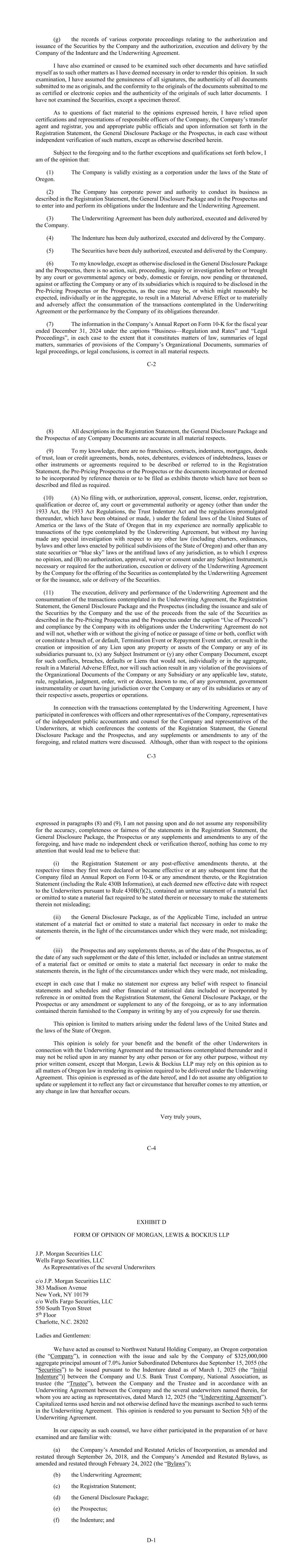 C-2 (g) the records of various corporate proceedings relating to the authorization and issuance of the Securities by the Company and the authorization, execution and delivery by the Company of the Indenture and the Underwriting Agreement. I have also examined or caused to be examined such other documents and have satisfied myself as to such other matters as I have deemed necessary in order to render this opinion. In such examination, I have assumed the genuineness of all signatures, the authenticity of all documents submitted to me as originals, and the conformity to the originals of the documents submitted to me as certified or electronic copies and the authenticity of the originals of such latter documents. I have not examined the Securities, except a specimen thereof. As to questions of fact material to the opinions expressed herein, I have relied upon certifications and representations of responsible officers of the Company, the Company’s transfer agent and registrar, you and appropriate public officials and upon information set forth in the Registration Statement, the General Disclosure Package or the Prospectus, in each case without independent verification of such matters, except as otherwise described herein. Subject to the foregoing and to the further exceptions and qualifications set forth below, I am of the opinion that: (1) The Company is validly existing as a corporation under the laws of the State of Oregon. (2) The Company has corporate power and authority to conduct its business as described in the Registration Statement, the General Disclosure Package and in the Prospectus and to enter into and perform its obligations under the Indenture and the Underwriting Agreement. (3) The Underwriting Agreement has been duly authorized, executed and delivered by the Company. (4) The Indenture has been duly authorized, executed and delivered by the Company. (5) The Securities have been duly authorized, executed and delivered by the Company. (6) To my knowledge, except as otherwise disclosed in the General Disclosure Package and the Prospectus, there is no action, suit, proceeding, inquiry or investigation before or brought by any court or governmental agency or body, domestic or foreign, now pending or threatened, against or affecting the Company or any of its subsidiaries which is required to be disclosed in the Pre-Pricing Prospectus or the Prospectus, as the case may be, or which might reasonably be expected, individually or in the aggregate, to result in a Material Adverse Effect or to materially and adversely affect the consummation of the transactions contemplated in the Underwriting Agreement or the performance by the Company of its obligations thereunder. (7) The information in the Company’s Annual Report on Form 10-K for the fiscal year ended December 31, 2024 under the captions “Business—Regulation and Rates” and “Legal Proceedings”, in each case to the extent that it constitutes matters of law, summaries of legal matters, summaries of provisions of the Company’s Organizational Documents, summaries of legal proceedings, or legal conclusions, is correct in all material respects. C-3 (8) All descriptions in the Registration Statement, the General Disclosure Package and the Prospectus of any Company Documents are accurate in all material respects. (9) To my knowledge, there are no franchises, contracts, indentures, mortgages, deeds of trust, loan or credit agreements, bonds, notes, debentures, evidences of indebtedness, leases or other instruments or agreements required to be described or referred to in the Registration Statement, the Pre-Pricing Prospectus or the Prospectus or the documents incorporated or deemed to be incorporated by reference therein or to be filed as exhibits thereto which have not been so described and filed as required. (10) (A) No filing with, or authorization, approval, consent, license, order, registration, qualification or decree of, any court or governmental authority or agency (other than under the 1933 Act, the 1933 Act Regulations, the Trust Indenture Act and the regulations promulgated thereunder, which have been obtained or made, ) under the federal laws of the United States of America or the laws of the State of Oregon that in my experience are normally applicable to transactions of the type contemplated by the Underwriting Agreement, but without my having made any special investigation with respect to any other law (including charters, ordinances, bylaws and other laws enacted by political subdivisions of the State of Oregon) and other than any state securities or “blue sky” laws or the antifraud laws of any jurisdiction, as to which I express no opinion, and (B) no authorization, approval, waiver or consent under any Subject Instrument,is necessary or required for the authorization, execution or delivery of the Underwriting Agreement by the Company for the offering of the Securities as contemplated by the Underwriting Agreement or for the issuance, sale or delivery of the Securities. (11) The execution, delivery and performance of the Underwriting Agreement and the consummation of the transactions contemplated in the Underwriting Agreement, the Registration Statement, the General Disclosure Package and the Prospectus (including the issuance and sale of the Securities by the Company and the use of the proceeds from the sale of the Securities as described in the Pre-Pricing Prospectus and the Prospectus under the caption “Use of Proceeds”) and compliance by the Company with its obligations under the Underwriting Agreement do not and will not, whether with or without the giving of notice or passage of time or both, conflict with or constitute a breach of, or default, Termination Event or Repayment Event under, or result in the creation or imposition of any Lien upon any property or assets of the Company or any of its subsidiaries pursuant to, (x) any Subject Instrument or (y) any other Company Document, except for such c