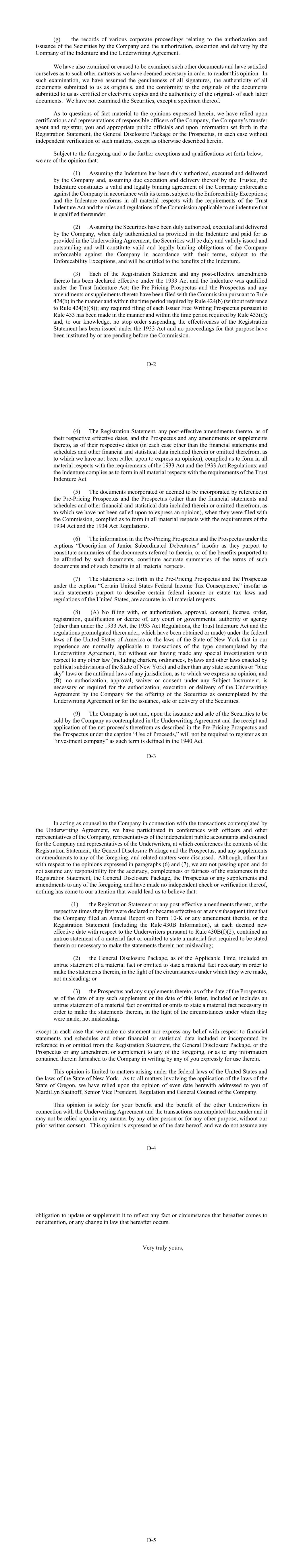 D-2 (g) the records of various corporate proceedings relating to the authorization and issuance of the Securities by the Company and the authorization, execution and delivery by the Company of the Indenture and the Underwriting Agreement. We have also examined or caused to be examined such other documents and have satisfied ourselves as to such other matters as we have deemed necessary in order to render this opinion. In such examination, we have assumed the genuineness of all signatures, the authenticity of all documents submitted to us as originals, and the conformity to the originals of the documents submitted to us as certified or electronic copies and the authenticity of the originals of such latter documents. We have not examined the Securities, except a specimen thereof. As to questions of fact material to the opinions expressed herein, we have relied upon certifications and representations of responsible officers of the Company, the Company’s transfer agent and registrar, you and appropriate public officials and upon information set forth in the Registration Statement, the General Disclosure Package or the Prospectus, in each case without independent verification of such matters, except as otherwise described herein. Subject to the foregoing and to the further exceptions and qualifications set forth below, we are of the opinion that: (1) Assuming the Indenture has been duly authorized, executed and delivered by the Company and, assuming due execution and delivery thereof by the Trustee, the Indenture constitutes a valid and legally binding agreement of the Company enforceable against the Company in accordance with its terms, subject to the Enforceability Exceptions; and the Indenture conforms in all material respects with the requirements of the Trust Indenture Act and the rules and regulations of the Commission applicable to an indenture that is qualified thereunder. (2) Assuming the Securities have been duly authorized, executed and delivered by the Company, when duly authenticated as provided in the Indenture and paid for as provided in the Underwriting Agreement, the Securities will be duly and validly issued and outstanding and will constitute valid and legally binding obligations of the Company enforceable against the Company in accordance with their terms, subject to the Enforceability Exceptions, and will be entitled to the benefits of the Indenture. (3) Each of the Registration Statement and any post-effective amendments thereto has been declared effective under the 1933 Act and the Indenture was qualified under the Trust Indenture Act; the Pre-Pricing Prospectus and the Prospectus and any amendments or supplements thereto have been filed with the Commission pursuant to Rule 424(b) in the manner and within the time period required by Rule 424(b) (without reference to Rule 424(b)(8)); any required filing of each Issuer Free Writing Prospectus pursuant to Rule 433 has been made in the manner and within the time period required by Rule 433(d); and, to our knowledge, no stop order suspending the effectiveness of the Registration Statement has been issued under the 1933 Act and no proceedings for that purpose have been instituted by or are pending before the Commission. D-3 (4) The Registration Statement, any post-effective amendments thereto, as of their respective effective dates, and the Prospectus and any amendments or supplements thereto, as of their respective dates (in each case other than the financial statements and schedules and other financial and statistical data included therein or omitted therefrom, as to which we have not been called upon to express an opinion), complied as to form in all material respects with the requirements of the 1933 Act and the 1933 Act Regulations; and the Indenture complies as to form in all material respects with the requirements of the Trust Indenture Act. (5) The documents incorporated or deemed to be incorporated by reference in the Pre-Pricing Prospectus and the Prospectus (other than the financial statements and schedules and other financial and statistical data included therein or omitted therefrom, as to which we have not been called upon to express an opinion), when they were filed with the Commission, complied as to form in all material respects with the requirements of the 1934 Act and the 1934 Act Regulations. (6) The information in the Pre-Pricing Prospectus and the Prospectus under the captions “Description of Junior Subordinated Debentures” insofar as they purport to constitute summaries of the documents referred to therein, or of the benefits purported to be afforded by such documents, constitute accurate summaries of the terms of such documents and of such benefits in all material respects. (7) The statements set forth in the Pre-Pricing Prospectus and the Prospectus under the caption “Certain United States Federal Income Tax Consequence,” insofar as such statements purport to describe certain federal income or estate tax laws and regulations of the United States, are accurate in all material respects. (8) (A) No filing with, or authorization, approval, consent, license, order, registration, qualification or decree of, any court or governmental authority or agency (other than under the 1933 Act, the 1933 Act Regulations, the Trust Indenture Act and the regulations promulgated thereunder, which have been obtained or made) under the federal laws of the United States of America or the laws of the State of New York that in our experience are normally applicable to transactions of the type contemplated by the Underwriting Agreement, but without our having made any special investigation with respect to any other law (including charters, ordinances, bylaws and other laws enacted by political subdivisions of the State of New York) and other than any state securities or “blue sky” laws or the antifraud laws of any jurisdiction, as to which we express no opinion, and (B) no authorization, approval, waiver or consen