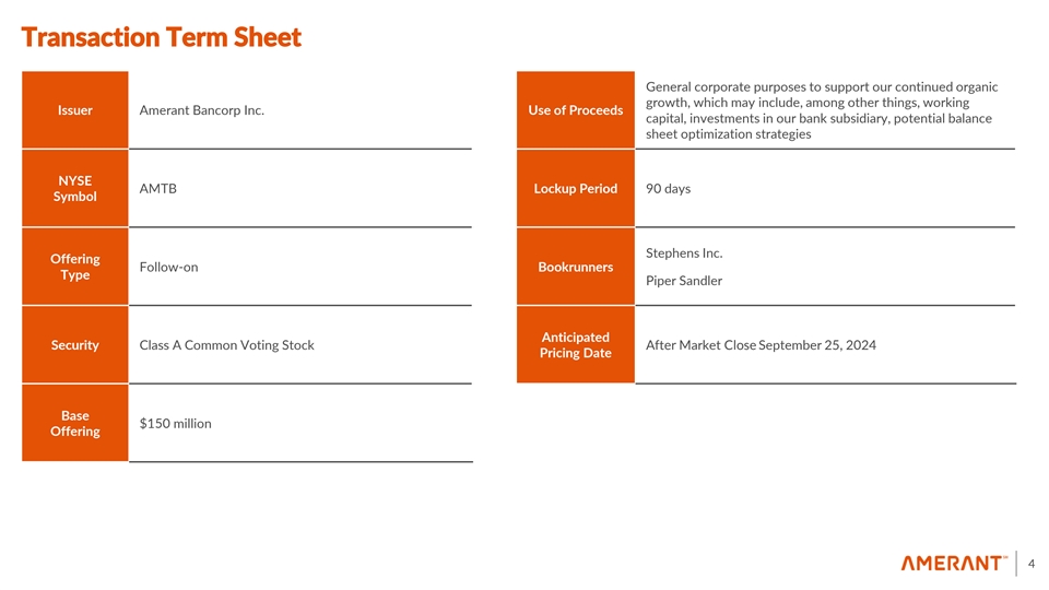 Important Notices and Disclaimers (continued) Preliminary Financial Information This presentation includes certain preliminary unaudited financial information and expectations relating to the third quarter of 2024. Our third quarter of 2024 has not yet concluded and such results are preliminary estimates based upon currently available information. In the opinion of management, such unaudited financial information includes all adjustments (consisting of normal recurring adjustments) necessary for a fair presentation of our financial position and results of operations for such periods, but may not include normal quarter-end adjustments. These results are also subject to further revision based upon final actual results for the entire quarter ending September 30, 2024, our review and the review of our independent auditors of such quarterly results and an audit by our independent auditors of our annual results for the year ended December 31, 2024. Therefore, no assurance can be given that, upon completion of our review and the review of our independent auditors, we will not report materially different financial results than those set forth below. We cannot assure you that such results will be indicative of our results for the entire quarter ending September 30, 2024 or for the entire year ending December 31, 2024. Further, although this presentation describes the current estimated impact of our potential use of a portion of the proceeds from this offering (including in connection with our future balance sheet optimization efforts, potential securities portfolio repositioning, and other actions described herein) any such actions will depend on a number of factors, including market conditions and business developments. We are not required to apply any portion of the net proceeds of this offering for any particular purpose, and our management will have broad discretion in allocating the net proceeds of the offering. Accordingly, our management may not apply the net proceeds of this offering toward the repositioning of our securities portfolio, and our future financial condition may differ significantly from the prospective estimates presented in this presentation. We do not intend to update or otherwise revise these expected events and estimates to reflect future events or changes in estimates and do not intend to disclose publicly whether our actual results will vary from our estimates other than through the release of actual results in the ordinary course of business. No independent public accounting firm has compiled, examined or performed any procedures with respect to the anticipated financial information contained above, nor have they expressed any opinion or other form of assurance on such information or its achievability. These estimates should not be regarded as a representation by us, our management or the underwriters as to our actual results for the third quarter. The assumptions and estimates underlying the estimated financial information are inherently uncertain and are subject to a wide variety of significant business, economic and competitive risks and uncertainties, including those described under “Risk Fa autc ion tors ary N ” aote nd “ RC egarding Forward-Looking Statements” in our SEC filings. Accordingly, you should not place undue reliance on these estimates. In addition, the repositioning of our balance sheet as described in this presentation is subject to and contingent upon the completion of this offering during the third quarter of 2024 on terms that are satisfactory to us. Although we may consider proceeding with the rebalancing in the event that this offering does not close on acceptable terms during the third quarter of 2024, we have not yet determined to do so. The repositioning will only occur, if at all, following our receipt of adequate capital. Additional Information This presentation shall not constitute an offer to sell or the solicitation of an offer to buy, nor shall there be any sale of common stock in any state or jurisdiction in which such offer, solicitation or sale would be unlawful prior to the registration or qualification under the securities laws of such state or jurisdiction. Neither the SEC nor any other regulatory body has approved or disapproved of the securities of the Company or passed upon the accuracy or adequacy of this presentation. Any representation to the contrary is a criminal offense. The offering of the shares will be made pursuant to an effective registration statement (including a base prospectus) filed by the Company with the SEC and a preliminary prospectus supplement, which the Company intends to file with the SEC. Before you invest, you should read the registration statement (including the base prospectus) and the preliminary prospectus supplement relating to the offering and the documents incorporated by reference therein and any other documents that the Company has filed with the SEC for more information about the Company and the offering. You may obtain these documents for free by visiting the SEC’s website at www.sec.gov. Alternatively, you may request copies of the base prospectus and preliminary prosp ent bey ctcuon s tsu acp tinplg S emtephens Inc. by telephone at (800) 643-9691 or by email at prospectus@stephens.com, and by contacting Piper Sandler & Co. by telephone at (800) 747-3924 or by email at prospectus@psc.com. 3