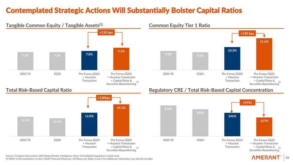 Contemplated Securities Repositioning (1) Highlights of the Contemplated Securities Repositioning Securities Investment Portfolio As of June 30, 2024 • Upon closing of the capital raise, we intend to execute a securities repositioning that will result in: Securities by Yield (fair value) Securities by Type (fair value) (1) – A transfer of all $220 million securities under HTM designation to AFS – A sale of all securities with current yields under 2.75% $1.5 billion – A sale of all corporate debt securities (including bank sub debt) WA Total securities Yield fair value • We expect this repositioning to improve our overall portfolio yield, increase 4.31% liquidity for future loan growth and better position the portfolio for a downward movement in rates • Estimated securities repositioning details: – Sale of $560 million of securities with an average yield of 3.2% U.S. Gov t sponsored enterprises Below A ield U.S. Gov t agency – After-tax loss of $50 million to $60 million including $10 million due to the Above A ield Corporate debt sale of HTM securities ▪ Additional unrealized after-tax loss of $4 million due to the reclassification of Contemplated Repositioning Estimated to Result in: remaining HTM securities to AFS • Improvement in run rate NIM and ROAA – Proceeds to be reinvested across a combination of securities and expected future loan growth • Eliminates corporate and bank credit risk from securities portfolio ▪ Anticipated securities reinvestment rate of 4.5% and loan reinvestment rate of • Shorter duration securities portfolio 7.0% • Stronger capital generation ▪ We expect up to $200 million of proceeds to be reinvested in near-term loan growth 9 Note: Please see Slides 2 and 3 for additional information you should consider. (1) Securities portfolio as of 6/30/2024.