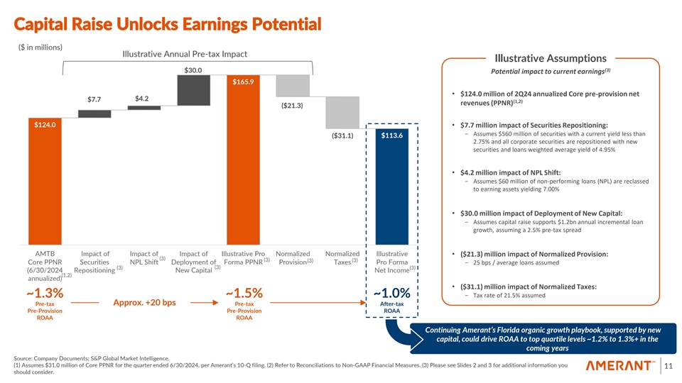 Contemplated Strategic Actions Will Substantially Bolster Capital Ratios (1) Tangible Common Equity / Tangible Assets Common Equity Tier 1 Ratio +130 bps +130 bps 11.6% 10.3% 9.1% 7.8% 9.8% 7.3% 7.3% 9.6% 2023 YE 2Q24 Pro Forma 2Q24 Pro Forma 2Q24 2023 YE 2Q24 Pro Forma 2Q24 Pro Forma 2Q24 + Houston + Houston Transaction + Houston + Houston Transaction Transaction + Capital Raise & Transaction + Capital Raise & (2) (2) Securities Repositioning Securities Repositioning Total Risk-Based Capital Ratio Regulatory CRE / Total Risk-Based Capital Concentration +130bps (19%) 14.1% 276% 260% 12.8% 246% 12.1% 227% 11.9% 2023 YE 2Q24 Pro Forma 2Q24 Pro Forma 2Q24 2023 YE 2Q24 Pro Forma 2Q24 Pro Forma 2Q24 + Houston + Houston Transaction + Houston + Houston Transaction Transaction + Capital Raise & Transaction + Capital Raise & (2) (2) Securities Repositioning Securities Repositioning Source: Company Documents; S&P Global Market Intelligence. Note: Consolidated regulatory capital used. 10 (1) Refer to Reconciliations to Non-GAAP Financial Measures. (2) Please see Slides 2 and 3 for additional information you should consider.