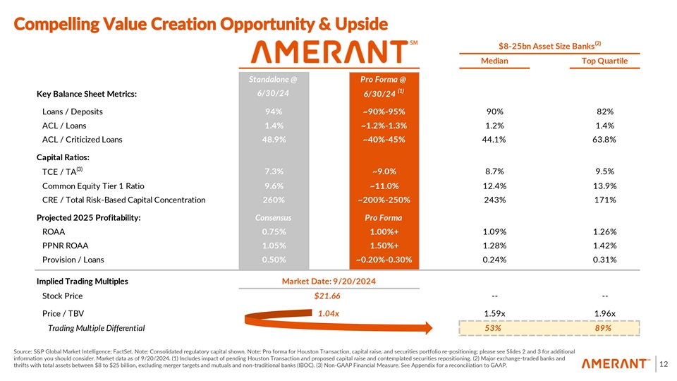 Capital Raise Unlocks Earnings Potential ($ in millions) Illustrative Annual Pre-tax Impact Illustrative Assumptions (3) $30.0 Potential impact to current earnings $165.9 • $124.0 million of 2Q24 annualized Core pre-provision net $4.2 $7.7 (1,2) revenues (PPNR) ($21.3) $124.0• $7.7 million impact of Securities Repositioning: - Assumes $560 million of securities with a current yield less than ($31.1) $113.6 2.75% and all corporate securities are repositioned with new securities and loans weighted average yield of 4.95% • $4.2 million impact of NPL Shift: - Assumes $60 million of non-performing loans (NPL) are reclassed to earning assets yielding 7.00% • $30.0 million impact of Deployment of New Capital: - Assumes capital raise supports $1.2bn annual incremental loan growth, assuming a 2.5% pre-tax spread AMTB Impact of Impact of Impact of Illustrative Pro Normalized Normalized Illustrative• ($21.3) million impact of Normalized Provision: (3) (3) (3) (3) Core PPNR Securities NPL Shift Deployment of Forma PPNR Provision Taxes Pro Forma - 25 bps / average loans assumed (3) (3) (3) (6/30/2024 Repositioning New Capital Net Income (1,2) annualized) • ($31.1) million impact of Normalized Taxes: ~1.3% ~1.5% ~1.0% - Tax rate of 21.5% assumed Approx. +20 bps Pre-tax Pre-tax After-tax Pre-Provision Pre-Provision ROAA ROAA ROAA Continuing Amerant’s Florida organic growth playbook, supported by new capital, could drive ROAA to top quartile levels ~1.2% to 1.3%+ in the coming years Source: Company Documents; S&P Global Market Intelligence. ( ) Assumes $ .0 million of Core PPNR for the quarter ended / 0/2024, -pe Q rf iling. Am e (2) ran Rt’ esf er 0 to Reconciliations to Non-GAAP Financial Measures. (3) Please see Slides 2 and 3 for additional information you 11 should consider.