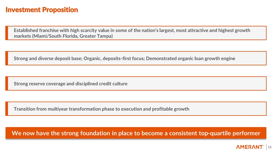 Compelling Value Creation Opportunity & Upside (2) $8-25bn Asset Size Banks Median Top Quartile Standalone @ Pro Forma @ (1) 6/30/24 Key Balance Sheet Metrics: 6/30/24 Loans / Deposits 94% ~90%-95% 90% 82% ACL / Loans 1.4% ~1.2%-1.3% 1.2% 1.4% ACL / Criticized Loans 48.9% ~40%-45% 44.1% 63.8% Capital Ratios: (3) 7.3% ~9.0% 8.7% 9.5% TCE / TA Common Equity Tier 1 Ratio 9.6% ~11.0% 12.4% 13.9% CRE / Total Risk-Based Capital Concentration 260% ~200%-250% 243% 171% Projected 2025 Profitability: Consensus Pro Forma ROAA 0.75% 1.00%+ 1.09% 1.26% PPNR ROAA 1.05% 1.50%+ 1.28% 1.42% Provision / Loans 0.50% ~0.20%-0.30% 0.24% 0.31% Implied Trading Multiples Market Date: 9/20/2024 Stock Price $21.66 -- -- Price / TBV 1.04x 1.59x 1.96x Trading Multiple Differential 53% 89% Source: S&P Global Market Intelligence; FactSet. Note: Consolidated regulatory capital shown. Note: Pro forma for Houston Transaction, capital raise, and securities portfolio re-positioning; please see Slides 2 and 3 for additional information you should consider. Market data as of 9/20/2024. (1) Includes impact of pending Houston Transaction and proposed capital raise and contemplated securities repositioning. (2) Major exchange-traded banks and thrifts with total assets between $8 to $25 billion, excluding merger targets and mutuals and non-traditional banks (IBOC). (3) Non-GAAP Financial Measure. See Appendix for a reconciliation to GAAP. 12