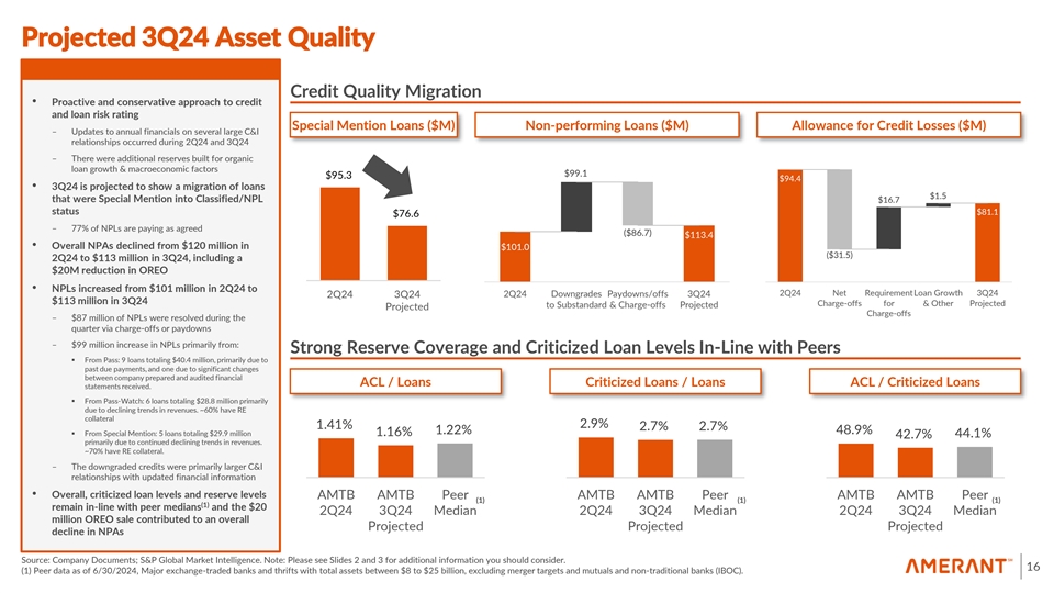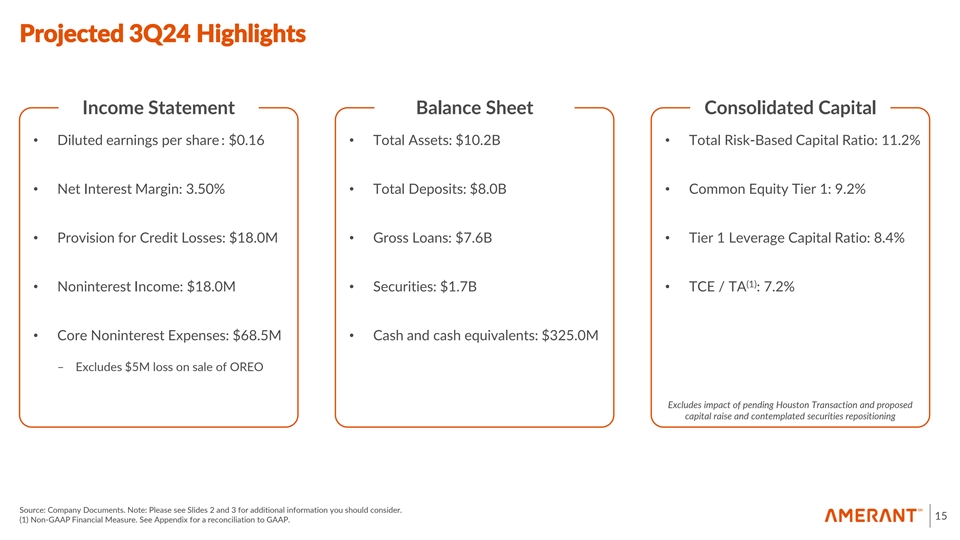 Projected 3Q24 Highlights Income Statement Balance Sheet Consolidated Capital • Diluted earnings per share : $0.16• Total Assets: $10.2B• Total Risk-Based Capital Ratio: 11.2% • Net Interest Margin: 3.50%• Total Deposits: $8.0B• Common Equity Tier 1: 9.2% • Provision for Credit Losses: $18.0M• Gross Loans: $7.6B• Tier 1 Leverage Capital Ratio: 8.4% (1) • Noninterest Income: $18.0M• Securities: $1.7B• TCE / TA : 7.2% • Core Noninterest Expenses: $68.5M• Cash and cash equivalents: $325.0M – Excludes $5M loss on sale of OREO Excludes impact of pending Houston Transaction and proposed capital raise and contemplated securities repositioning Source: Company Documents. Note: Please see Slides 2 and 3 for additional information you should consider. 15 (1) Non-GAAP Financial Measure. See Appendix for a reconciliation to GAAP.