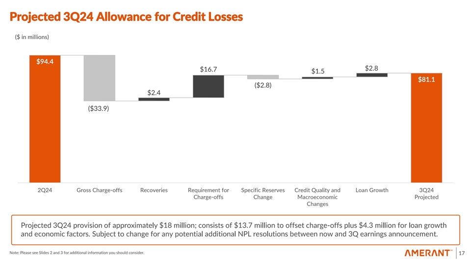 Projected 3Q24 Asset Quality Credit Quality Migration • Proactive and conservative approach to credit and loan risk rating Special Mention Loans ($M) Non-performing Loans ($M) Allowance for Credit Losses ($M) – Updates to annual financials on several large C&I relationships occurred during 2Q24 and 3Q24 – There were additional reserves built for organic loan growth & macroeconomic factors $99.1 $95.3 $94.4 • 3Q24 is projected to show a migration of loans $1.5 that were Special Mention into Classified/NPL $16.7 status $81.1 $76.6 – 77% of NPLs are paying as agreed ($86.7) $113.4 • Overall NPAs declined from $120 million in $101.0 ($31.5) 2Q24 to $113 million in 3Q24, including a $20M reduction in OREO • NPLs increased from $101 million in 2Q24 to 2Q24 Net RequirementLoan Growth 3Q24 2Q24 Downgrades Paydowns/offs 3Q24 2Q24 3Q24 $113 million in 3Q24 Charge-offs for & Other Projected to Substandard & Charge-offs Projected Projected Charge-offs – $87 million of NPLs were resolved during the quarter via charge-offs or paydowns – $99 million increase in NPLs primarily from: Strong Reserve Coverage and Criticized Loan Levels In-Line with Peers ▪ From Pass: 9 loans totaling $40.4 million, primarily due to past due payments, and one due to significant changes between company prepared and audited financial ACL / Loans Criticized Loans / Loans ACL / Criticized Loans statements received. ▪ From Pass-Watch: 6 loans totaling $28.8 million primarily due to declining trends in revenues. ~60% have RE collateral 1.41% 2.9% 2.7% 2.7% 1.22% 48.9% ▪ From Special Mention: 5 loans totaling $29.9 million 1.16% 44.1% 42.7% primarily due to continued declining trends in revenues. ~70% have RE collateral. – The downgraded credits were primarily larger C&I relationships with updated financial information • Overall, criticized loan levels and reserve levels AMTB AMTB Peer AMTB AMTB Peer AMTB AMTB Peer (1) (1) (1) (1) remain in-line with peer medians and the $20 2Q24 3Q24 Median 2Q24 3Q24 Median 2Q24 3Q24 Median million OREO sale contributed to an overall Projected Projected Projected decline in NPAs Source: Company Documents; S&P Global Market Intelligence. Note: Please see Slides 2 and 3 for additional information you should consider. 16 (1) Peer data as of 6/30/2024, Major exchange-traded banks and thrifts with total assets between $8 to $25 billion, excluding merger targets and mutuals and non-traditional banks (IBOC).