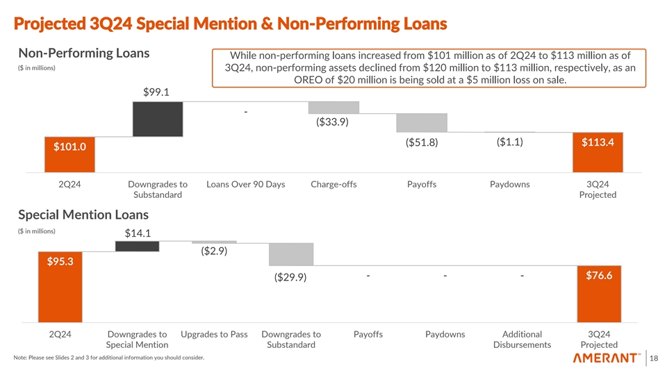 Projected 3Q24 Allowance for Credit Losses ($ in millions) $94.4 $2.8 $16.7 $1.5 $81.1 ($2.8) $2.4 ($33.9) 2Q24 Gross Charge-offs Recoveries Requirement for Specific Reserves Credit Quality and Loan Growth 3Q24 Charge-offs Change Macroeconomic Projected Changes Projected 3Q24 provision of approximately $18 million; consists of $13.7 million to offset charge-offs plus $4.3 million for loan growth and economic factors. Subject to change for any potential additional NPL resolutions between now and 3Q earnings announcement. Note: Please see Slides 2 and 3 for additional information you should consider. 17
