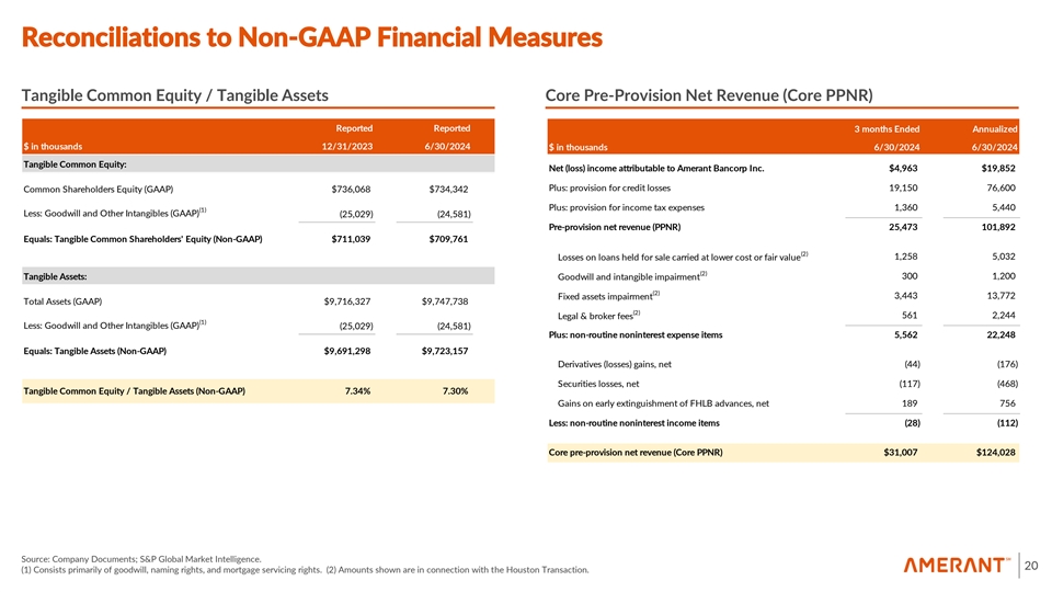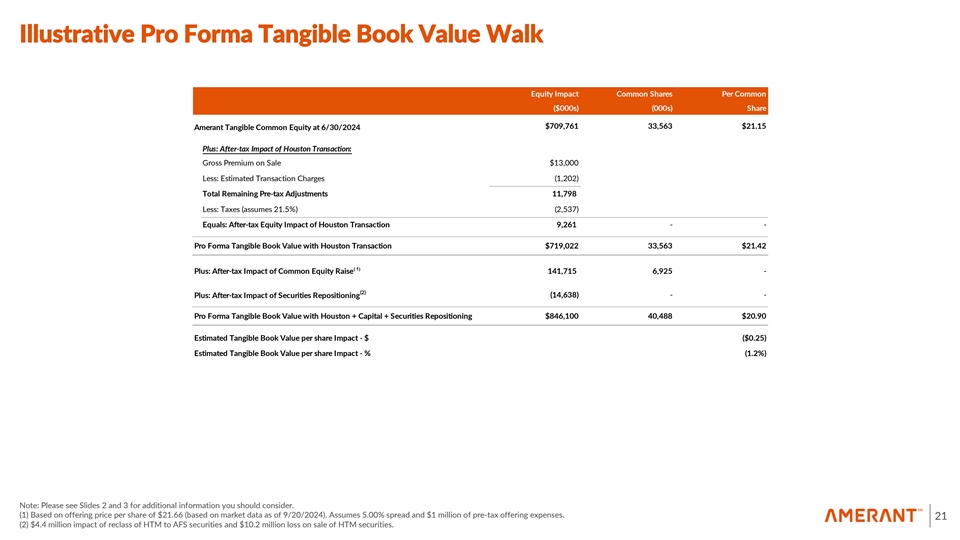 Reconciliations to Non-GAAP Financial Measures Tangible Common Equity / Tangible Assets Core Pre-Provision Net Revenue (Core PPNR) Reported Reported 3 months Ended Annualized $ in thousands 12/31/2023 6/30/2024 $ in thousands 6/30/2024 6/30/2024 Tangible Common Equity: Net (loss) income attributable to Amerant Bancorp Inc. $4,963 $19,852 Plus: provision for credit losses 19,150 76,600 Common Shareholders Equity (GAAP) $736,068 $734,342 Plus: provision for income tax expenses 1,360 5,440 (1) Less: Goodwill and Other Intangibles (GAAP) (25,029) (24,581) Pre-provision net revenue (PPNR) 25,473 101,892 Equals: Tangible Common Shareholders' Equity (Non-GAAP) $711,039 $709,761 (2) Losses on loans held for sale carried at lower cost or fair value 1,258 5,032 (2) 300 1,200 Tangible Assets: Goodwill and intangible impairment (2) Fixed assets impairment 3,443 13,772 Total Assets (GAAP) $9,716,327 $9,747,738 (2) 561 2,244 Legal & broker fees (1) Less: Goodwill and Other Intangibles (GAAP) (25,029) (24,581) Plus: non-routine noninterest expense items 5,562 22,248 Equals: Tangible Assets (Non-GAAP) $9,691,298 $9,723,157 Derivatives (losses) gains, net (44) (176) Securities losses, net (117) (468) Tangible Common Equity / Tangible Assets (Non-GAAP) 7.34% 7.30% Gains on early extinguishment of FHLB advances, net 189 756 Less: non-routine noninterest income items (28) (112) Core pre-provision net revenue (Core PPNR) $31,007 $124,028 Source: Company Documents; S&P Global Market Intelligence. 20 (1) Consists primarily of goodwill, naming rights, and mortgage servicing rights. (2) Amounts shown are in connection with the Houston Transaction.