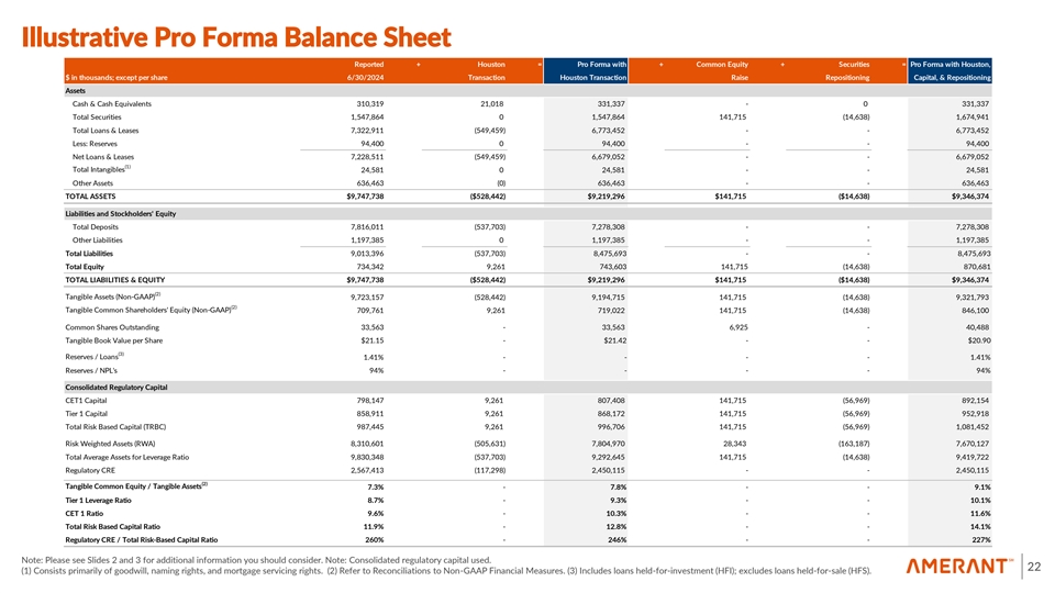 Illustrative Pro Forma Tangible Book Value Walk Equity Impact Common Shares Per Common ($000s) (000s) Share $709,761 33,563 $21.15 Amerant Tangible Common Equity at 6/30/2024 Plus: After-tax Impact of Houston Transaction: Gross Premium on Sale $13,000 Less: Estimated Transaction Charges (1,202) Total Remaining Pre-tax Adjustments 11,798 Less: Taxes (assumes 21.5%) (2,537) Equals: After-tax Equity Impact of Houston Transaction 9,261 - - Pro Forma Tangible Book Value with Houston Transaction $719,022 33,563 $21.42 ( 1) Plus: After-tax Impact of Common Equity Raise 141,715 6,925 - (2) (14,638) - - Plus: After-tax Impact of Securities Repositioning Pro Forma Tangible Book Value with Houston + Capital + Securities Repositioning $846,100 40,488 $20.90 Estimated Tangible Book Value per share Impact - $ ($0.25) Estimated Tangible Book Value per share Impact - % (1.2%) Note: Please see Slides 2 and 3 for additional information you should consider. (1) Based on offering price per share of $21.66 (based on market data as of 9/20/2024). Assumes 5.00% spread and $1 million of pre-tax offering expenses. 21 (2) $4.4 million impact of reclass of HTM to AFS securities and $10.2 million loss on sale of HTM securities.