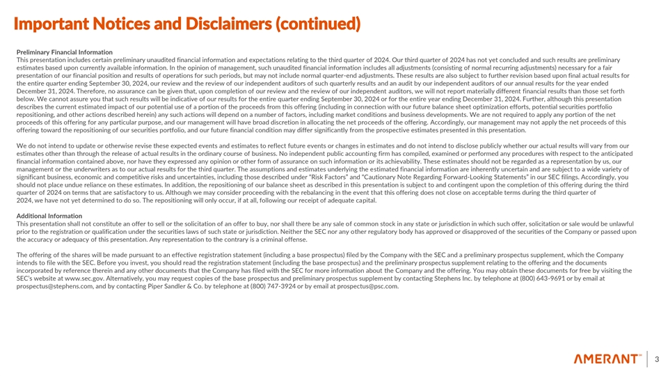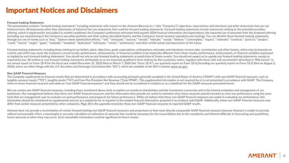 Important Notices and Disclaimers Forward-Looking Statements This presentation contains “forw-ard looking statements” including statements with respect Atmo eran thet Bancorp Inc.’s (the “Company’s”) objectives, expectations and intentions and other statements that are not historical facts. All statements other than statements of historical fact are statements that could be forward-looking statements. Forward-looking statements include statements relating to the potential securities offering, which is opportunistic and subject to market conditions, the Company’s preliminary estimated third anqu cart ial e inr form 202 at4 io nfin and expectations, the expected use of proceeds from the proposed offering (including any repositioning of the Company’s securities portfolio and other actions described herein), and th ue re C buom sinp ean ss oy’s f perat utions and strategy. You can identify these forward-looking statements through our use of words such as “may,” “balance sheet optimization efforts, “will,” “anticipate,” “assumceat,” e,”“sh “w ouou ld,”ld “in ,” “bdielieve,” “contemplate,” “expect,” “estimate,” “continue,” “point to,” “project,” “could,” “intend,” “target,” “goals,” “outlooks,” “modeled,” “dedicated,” “anticipate,” “create,” “preliminary,” mil anar d ot worhdesr ansid expressions of the future. Forward-looking statements, including those relating to our beliefs, plans, objectives, goals, expectations, anticipations, estimates and intentions, involve risks, uncertainties and other factors, which may be beyond our control, and which may cause the Company’s actual results, performance, achievements, or financial condition ditfo ferebe n m t from ate frial utluyre results, performance, achievements, or financial condition expressed or implied by such forward-looking statements. You should not rely on any forward-looking statements as predictions of future events. You should not expect us to update any forward-looking statements, except as required by law. All written or oral forward-looking statements attributable to us are expressly qualified in their entirety by this cautionary notice, together with those risks and uncertainties described in “Risk factors” in our annual report on Form 10-K for the fiscal year ended December 31, 2023 filed on March 7, 2024 (the Form 10-K ), our quarterly report on Form 10-Q (including our quarterly report on Form 10-Q filed on August 2, 2024), and in our other filings with the U.S. Securities and Exchange Commission (the “SEC”), which are a s wva eil bab sitele a wwt wt.h seec S .gov EC .’ Non-GAAP Financial Measures The Company supplements its financial results that are determined in accordance with accounting principles generally accepted in the United States of America (“GAAP”) w-ith GA An P on financial measures, such as tangible common equity ( TCE ), tangible assets (“TA”) and C -Prov oreision Pre Net Revenue (“Core PPNR ). This supplementmalat ioinnfor is not required by or is not presented in accordance with GAAP. The Company refers to these financial measures and ratios a -Gs AA“P nonfinancial measures” and they should not be considered in as isol a at suio bn stit or ute for the GAAP measures presented herein. We use certain non-GAAP financial measures, including those mentioned above, both to explain our results to shareholders and the investment community and in the internal evaluation and management of our businesses. Our management believes that these non-GAAP financial measures and the information they provide are useful to investors since these measures permit investors to view our performance using the same tools that our management uses to evaluate our past performance and prospects for future performance. While we believe that these non-GAAP financial measures are useful in evaluating our performance, this information should be considered as supplemental and not as a substitute for or superior to the related financial information prepared in accordance with GAAP. Additionally, these non-GAAP financial measures may differ from similar measures presented by other companies. Page 20 in the appendix reconciles these non-GAAP financial measures to reported GAAP results. Amerant does not provide a reconciliation of certain forward-looking non-GAAP financial measures and projections to their most directly comparable GAAP financial measures because Amerant is unable to provide, without unreasonable effort, a meaningful or accurate calculation or estimation of amounts that would be necessary for the reconciliation due to the complexity and inherent difficulty in forecasting and quantifying future amounts or when they may occur. Such unavailable information could be significant to future results. 2