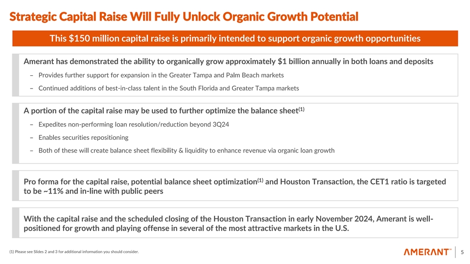 Transaction Term Sheet General corporate purposes to support our continued organic growth, which may include, among other things, working Issuer Amerant Bancorp Inc. Use of Proceeds capital, investments in our bank subsidiary, potential balance sheet optimization strategies NYSE AMTB Lockup Period 90 days Symbol Stephens Inc. Offering Follow-on Bookrunners Type Piper Sandler Anticipated Security Class A Common Voting Stock After Market Close September 25, 2024 Pricing Date Base $150 million Offering 4