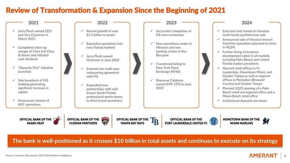 Strategic Capital Raise Will Fully Unlock Organic Growth Potential This $150 million capital raise is primarily intended to support organic growth opportunities Amerant has demonstrated the ability to organically grow approximately $1 billion annually in both loans and deposits - Provides further support for expansion in the Greater Tampa and Palm Beach markets - Continued additions of best-in-class talent in the South Florida and Greater Tampa markets (1) A portion of the capital raise may be used to further optimize the balance sheet - Expedites non-performing loan resolution/reduction beyond 3Q24 - Enables securities repositioning - Both of these will create balance sheet flexibility & liquidity to enhance revenue via organic loan growth (1) Pro forma for the capital raise, potential balance sheet optimization and Houston Transaction, the CET1 ratio is targeted to be ~11% and in-line with public peers With the capital raise and the scheduled closing of the Houston Transaction in early November 2024, Amerant is well- positioned for growth and playing offense in several of the most attractive markets in the U.S. (1) Please see Slides 2 and 3 for additional information you should consider. 5