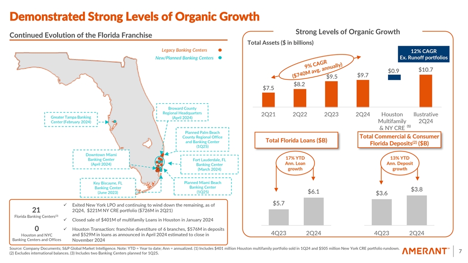 Review of Transformation & Expansion Since the Beginning of 2021 2021 2022 2023 2024 ✓ Jerry Plush named CEO ✓ Record growth of over ✓ Successful completion of ✓ Executed and closed on Houston and Vice Chairman in $1.5 billion in assets FIS core conversion multi-family portfolio loan sale March 2021 ✓ Announced sale of Houston branch ✓ Expanded operations into ✓ New operations center in franchise operations (planned to close in 4Q24) ✓ Completed clean-up new Florida markets Miramar and new merger of Class A & Class banking center in Key ✓ Further hiring of business B shares and initiated Biscayne development talent in all markets ✓ Jerry Plush named cash dividend including Palm Beach and central Chairman in June 2022 Florida market presidents ✓ Transferred listing to ✓ “Deposits First” initiative New York Stock ✓ Opened retail offices in Ft. ✓ Entered into multi-year launched Exchange (NYSE) Lauderdale, Downtown Miami, and outsourcing agreement Greater Tampa as well as regional with FIS offices in Plantation (Broward ✓ Sale leaseback of HQ ✓ Sharymar Calderon County) and Greater Tampa building generating named EVP, CFO in June ✓ Expanded/new significant increase in 2023✓ Planned 1Q25 opening of a Palm partnerships with well capital Beach retail and regional office and a known South Florida Miami Beach retail office professional sports teams ✓ Announced closure of to drive brand awareness ✓ Institutional deposits run-down NYC operations The bank is well-positioned as it crosses $10 billion in total assets and continues to execute on its strategy Source: Company Documents; S&P Global Market Intelligence. 6