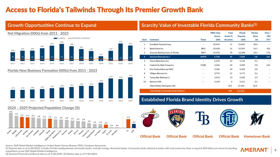 Access to Florida’s Tailwinds Through Its Premier Growth Bank (1) Growth Opportunities Continue to Expand Scarcity Value of Investable Florida Community Banks MRQ Total Total Florida Market Price / Net Migration (000s) from 2011 - 2023 Assets Active FL Deposits Share TBV FL RIDA NATI NAL A ERAGE (3) Rank Institution Ticker ($M) Branches ($M) (%) (%) 4 404 0 1 EverBank Financial Corp. -- 39,454 11 25,045 20.6 -- 00 2 2 BankUnited Inc. BKU 35,428 51 19,581 16.1 105 24 24 2 2 20 3 Seacoast Banking Corp. of Florida SBCF 14,953 78 12,288 10.1 178 4 (2) 44 4 42 4 4 4 40 4 Amerant Bancorp Inc. AMTB 9,748 19 7,028 5.8 102 0 2 24 0 4 5 Ocean Bankshares Inc. -- 6,374 23 5,126 4.2 -- 20 20 2 20 20 4 20 20 20 20 20 2020 202 2022 202 6 Capital City Bank Group Inc. CCBG 4,226 54 3,409 2.8 166 7 First Federal Bancorp MHC -- 4,186 24 3,350 2.8 -- Florida New Business Formation (000s) from 2011 - 2023 8 Villages Bancorp Inc. -- 3,776 21 3,171 2.6 -- 9 Tampa Bay Banking Co. -- 2,913 13 2,828 2.3 -- 0 10 Banesco USA -- 4,169 6 2,511 2.1 -- 4 Other Market Participants (66) 305 37,485 30.8 2 2 2 2 2 0 2 2 (1) Total Florida Community Bank Market 605 121,821 Established Florida Brand Identity Drives Growth 20 20 2 20 20 4 20 20 20 20 20 2020 202 2022 202 2024 – 2029 Projected Population Change (%) .0 . . . . . . . . . .0 4. 4. 4.2 . 2. 2.4 2. 2.4 2.0 0.4 0.4 Official Bank Official Bank Official Bank Official Bank Hometown Bank Source: S&P Global Market Intelligence; United States Census Bureau; FDIC; Company documents. (1) Deposit data as of 6/30/2023; Includes Florida-headquartered community banks, excludes foreign-domiciled banks; Community banks defined as banks with total assets less than or equal to $50 billion pro forma for pending 8 acquisitions as per S&P Global Market Intelligence. (2) Amerant Financial and Branch data as of 6/30/2024. (3) Market data as of 9/20/2024.