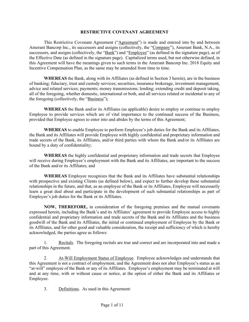 Page 1 of 11 RESTRICTIVE COVENANT AGREEMENT This Restrictive Covenant Agreement (“Agreement”) is made and entered into by and between Amerant Bancorp Inc., its successors and assigns (collectively, the “Company”), Amerant Bank, N.A., its successors, and assigns (collectively, the “Bank”) and “Employee” (as defined in the signature page), as of the Effective Date (as defined in the signature page). Capitalized terms used, but not otherwise defined, in this Agreement will have the meanings given to such terms in the Amerant Bancorp Inc. 2018 Equity and Incentive Compensation Plan, as the same may be amended from time to time. WHEREAS the Bank, along with its Affiliates (as defined in Section 3 herein), are in the business of banking; fiduciary, trust and custody services; securities, insurance brokerage, investment management, advice and related services; payments; money transmissions; lending; extending credit and deposit taking, all of the foregoing, whether domestic, international or both, and all services related or incidental to any of the foregoing (collectively, the “Business”); WHEREAS the Bank and/or its Affiliates (as applicable) desire to employ or continue to employ Employee to provide services which are of vital importance to the continued success of the Business, provided that Employee agrees to enter into and abides by the terms of this Agreement; WHEREAS to enable Employee to perform Employee’s job duties for the Bank and its Affiliates, the Bank and its Affiliates will provide Employee with highly confidential and proprietary information and trade secrets of the Bank, its Affiliates, and/or third parties with whom the Bank and/or its Affiliates are bound by a duty of confidentiality; WHEREAS the highly confidential and proprietary information and trade secrets that Employee will receive during Employee’s employment with the Bank and its Affiliates, are important to the success of the Bank and/or its Affiliates; and WHEREAS Employee recognizes that the Bank and its Affiliates have substantial relationships with prospective and existing Clients (as defined below), and expect to further develop these substantial relationships in the future, and that, as an employee of the Bank or its Affiliates, Employee will necessarily learn a great deal about and participate in the development of such substantial relationships as part of Employee’s job duties for the Bank or its Affiliates. NOW, THEREFORE, in consideration of the foregoing premises and the mutual covenants expressed herein, including the Bank’s and its Affiliates’ agreement to provide Employee access to highly confidential and proprietary information and trade secrets of the Bank and its Affiliates and the business goodwill of the Bank and its Affiliates, the initial or continued employment of Employee by the Bank or its Affiliates, and for other good and valuable consideration, the receipt and sufficiency of which is hereby acknowledged, the parties agree as follows: 1. Recitals. The foregoing recitals are true and correct and are incorporated into and made a part of this Agreement. 2. At-Will Employment Status of Employee. Employee acknowledges and understands that this Agreement is not a contract of employment, and the Agreement does not alter Employee’s status as an “at-will” employee of the Bank or any of its Affiliates. Employee’s employment may be terminated at will and at any time, with or without cause or notice, at the option of either the Bank and its Affiliates or Employee. 3. Definitions. As used in this Agreement: