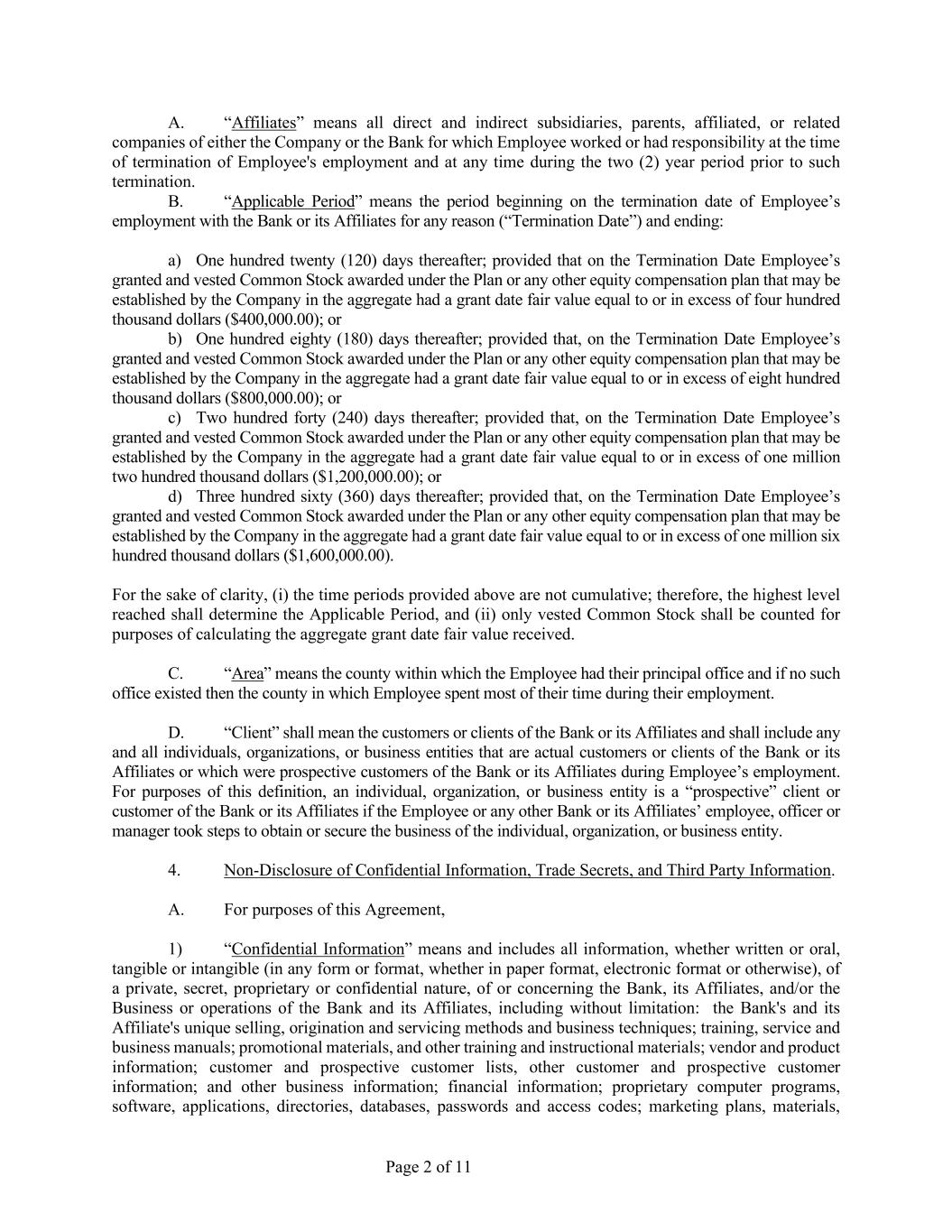Page 2 of 11 A. “Affiliates” means all direct and indirect subsidiaries, parents, affiliated, or related companies of either the Company or the Bank for which Employee worked or had responsibility at the time of termination of Employee's employment and at any time during the two (2) year period prior to such termination. B. “Applicable Period” means the period beginning on the termination date of Employee’s employment with the Bank or its Affiliates for any reason (“Termination Date”) and ending: a) One hundred twenty (120) days thereafter; provided that on the Termination Date Employee’s granted and vested Common Stock awarded under the Plan or any other equity compensation plan that may be established by the Company in the aggregate had a grant date fair value equal to or in excess of four hundred thousand dollars ($400,000.00); or b) One hundred eighty (180) days thereafter; provided that, on the Termination Date Employee’s granted and vested Common Stock awarded under the Plan or any other equity compensation plan that may be established by the Company in the aggregate had a grant date fair value equal to or in excess of eight hundred thousand dollars ($800,000.00); or c) Two hundred forty (240) days thereafter; provided that, on the Termination Date Employee’s granted and vested Common Stock awarded under the Plan or any other equity compensation plan that may be established by the Company in the aggregate had a grant date fair value equal to or in excess of one million two hundred thousand dollars ($1,200,000.00); or d) Three hundred sixty (360) days thereafter; provided that, on the Termination Date Employee’s granted and vested Common Stock awarded under the Plan or any other equity compensation plan that may be established by the Company in the aggregate had a grant date fair value equal to or in excess of one million six hundred thousand dollars ($1,600,000.00). For the sake of clarity, (i) the time periods provided above are not cumulative; therefore, the highest level reached shall determine the Applicable Period, and (ii) only vested Common Stock shall be counted for purposes of calculating the aggregate grant date fair value received. C. “Area” means the county within which the Employee had their principal office and if no such office existed then the county in which Employee spent most of their time during their employment. D. “Client” shall mean the customers or clients of the Bank or its Affiliates and shall include any and all individuals, organizations, or business entities that are actual customers or clients of the Bank or its Affiliates or which were prospective customers of the Bank or its Affiliates during Employee’s employment. For purposes of this definition, an individual, organization, or business entity is a “prospective” client or customer of the Bank or its Affiliates if the Employee or any other Bank or its Affiliates’ employee, officer or manager took steps to obtain or secure the business of the individual, organization, or business entity. 4. Non-Disclosure of Confidential Information, Trade Secrets, and Third Party Information. A. For purposes of this Agreement, 1) “Confidential Information” means and includes all information, whether written or oral, tangible or intangible (in any form or format, whether in paper format, electronic format or otherwise), of a private, secret, proprietary or confidential nature, of or concerning the Bank, its Affiliates, and/or the Business or operations of the Bank and its Affiliates, including without limitation: the Bank's and its Affiliate's unique selling, origination and servicing methods and business techniques; training, service and business manuals; promotional materials, and other training and instructional materials; vendor and product information; customer and prospective customer lists, other customer and prospective customer information; and other business information; financial information; proprietary computer programs, software, applications, directories, databases, passwords and access codes; marketing plans, materials,