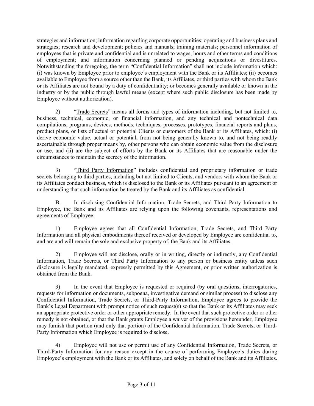Page 3 of 11 strategies and information; information regarding corporate opportunities; operating and business plans and strategies; research and development; policies and manuals; training materials; personnel information of employees that is private and confidential and is unrelated to wages, hours and other terms and conditions of employment; and information concerning planned or pending acquisitions or divestitures. Notwithstanding the foregoing, the term “Confidential Information” shall not include information which: (i) was known by Employee prior to employee’s employment with the Bank or its Affiliates; (ii) becomes available to Employee from a source other than the Bank, its Affiliates, or third parties with whom the Bank or its Affiliates are not bound by a duty of confidentiality; or becomes generally available or known in the industry or by the public through lawful means (except where such public disclosure has been made by Employee without authorization). 2) “Trade Secrets” means all forms and types of information including, but not limited to, business, technical, economic, or financial information, and any technical and nontechnical data compilations, programs, devices, methods, techniques, processes, prototypes, financial reports and plans, product plans, or lists of actual or potential Clients or customers of the Bank or its Affiliates, which: (i) derive economic value, actual or potential, from not being generally known to, and not being readily ascertainable through proper means by, other persons who can obtain economic value from the disclosure or use, and (ii) are the subject of efforts by the Bank or its Affiliates that are reasonable under the circumstances to maintain the secrecy of the information. 3) “Third Party Information” includes confidential and proprietary information or trade secrets belonging to third parties, including but not limited to Clients, and vendors with whom the Bank or its Affiliates conduct business, which is disclosed to the Bank or its Affiliates pursuant to an agreement or understanding that such information be treated by the Bank and its Affiliates as confidential. B. In disclosing Confidential Information, Trade Secrets, and Third Party Information to Employee, the Bank and its Affiliates are relying upon the following covenants, representations and agreements of Employee: 1) Employee agrees that all Confidential Information, Trade Secrets, and Third Party Information and all physical embodiments thereof received or developed by Employee are confidential to, and are and will remain the sole and exclusive property of, the Bank and its Affiliates. 2) Employee will not disclose, orally or in writing, directly or indirectly, any Confidential Information, Trade Secrets, or Third Party Information to any person or business entity unless such disclosure is legally mandated, expressly permitted by this Agreement, or prior written authorization is obtained from the Bank. 3) In the event that Employee is requested or required (by oral questions, interrogatories, requests for information or documents, subpoena, investigative demand or similar process) to disclose any Confidential Information, Trade Secrets, or Third-Party Information, Employee agrees to provide the Bank’s Legal Department with prompt notice of such request(s) so that the Bank or its Affiliates may seek an appropriate protective order or other appropriate remedy. In the event that such protective order or other remedy is not obtained, or that the Bank grants Employee a waiver of the provisions hereunder, Employee may furnish that portion (and only that portion) of the Confidential Information, Trade Secrets, or Third- Party Information which Employee is required to disclose. 4) Employee will not use or permit use of any Confidential Information, Trade Secrets, or Third-Party Information for any reason except in the course of performing Employee’s duties during Employee’s employment with the Bank or its Affiliates, and solely on behalf of the Bank and its Affiliates.