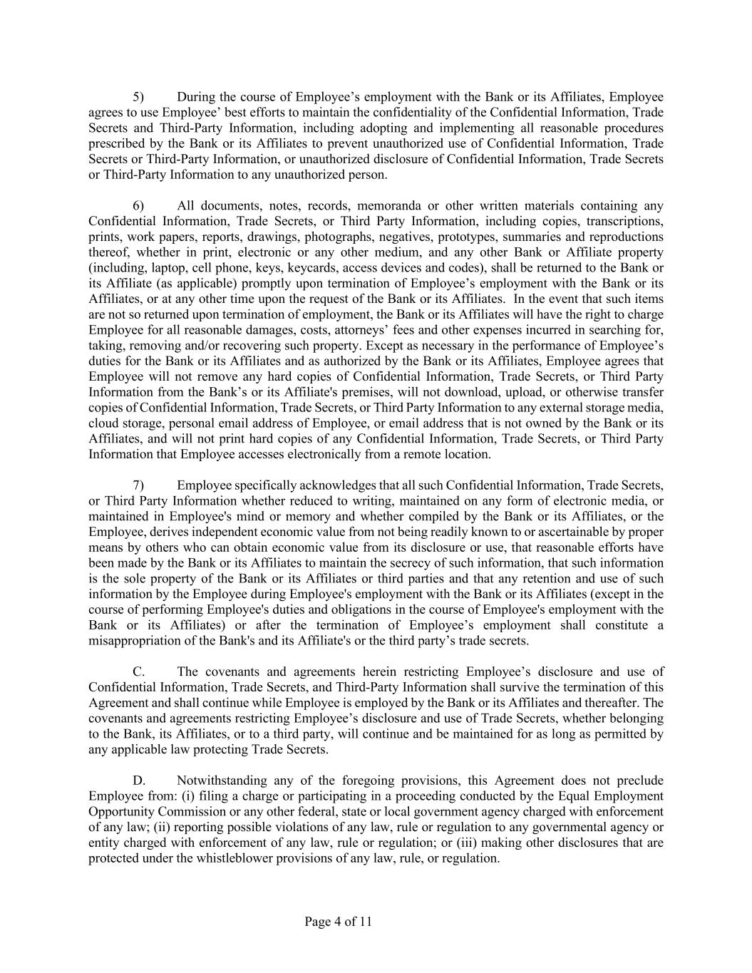Page 4 of 11 5) During the course of Employee’s employment with the Bank or its Affiliates, Employee agrees to use Employee’ best efforts to maintain the confidentiality of the Confidential Information, Trade Secrets and Third-Party Information, including adopting and implementing all reasonable procedures prescribed by the Bank or its Affiliates to prevent unauthorized use of Confidential Information, Trade Secrets or Third-Party Information, or unauthorized disclosure of Confidential Information, Trade Secrets or Third-Party Information to any unauthorized person. 6) All documents, notes, records, memoranda or other written materials containing any Confidential Information, Trade Secrets, or Third Party Information, including copies, transcriptions, prints, work papers, reports, drawings, photographs, negatives, prototypes, summaries and reproductions thereof, whether in print, electronic or any other medium, and any other Bank or Affiliate property (including, laptop, cell phone, keys, keycards, access devices and codes), shall be returned to the Bank or its Affiliate (as applicable) promptly upon termination of Employee’s employment with the Bank or its Affiliates, or at any other time upon the request of the Bank or its Affiliates. In the event that such items are not so returned upon termination of employment, the Bank or its Affiliates will have the right to charge Employee for all reasonable damages, costs, attorneys’ fees and other expenses incurred in searching for, taking, removing and/or recovering such property. Except as necessary in the performance of Employee’s duties for the Bank or its Affiliates and as authorized by the Bank or its Affiliates, Employee agrees that Employee will not remove any hard copies of Confidential Information, Trade Secrets, or Third Party Information from the Bank’s or its Affiliate's premises, will not download, upload, or otherwise transfer copies of Confidential Information, Trade Secrets, or Third Party Information to any external storage media, cloud storage, personal email address of Employee, or email address that is not owned by the Bank or its Affiliates, and will not print hard copies of any Confidential Information, Trade Secrets, or Third Party Information that Employee accesses electronically from a remote location. 7) Employee specifically acknowledges that all such Confidential Information, Trade Secrets, or Third Party Information whether reduced to writing, maintained on any form of electronic media, or maintained in Employee's mind or memory and whether compiled by the Bank or its Affiliates, or the Employee, derives independent economic value from not being readily known to or ascertainable by proper means by others who can obtain economic value from its disclosure or use, that reasonable efforts have been made by the Bank or its Affiliates to maintain the secrecy of such information, that such information is the sole property of the Bank or its Affiliates or third parties and that any retention and use of such information by the Employee during Employee's employment with the Bank or its Affiliates (except in the course of performing Employee's duties and obligations in the course of Employee's employment with the Bank or its Affiliates) or after the termination of Employee’s employment shall constitute a misappropriation of the Bank's and its Affiliate's or the third party’s trade secrets. C. The covenants and agreements herein restricting Employee’s disclosure and use of Confidential Information, Trade Secrets, and Third-Party Information shall survive the termination of this Agreement and shall continue while Employee is employed by the Bank or its Affiliates and thereafter. The covenants and agreements restricting Employee’s disclosure and use of Trade Secrets, whether belonging to the Bank, its Affiliates, or to a third party, will continue and be maintained for as long as permitted by any applicable law protecting Trade Secrets. D. Notwithstanding any of the foregoing provisions, this Agreement does not preclude Employee from: (i) filing a charge or participating in a proceeding conducted by the Equal Employment Opportunity Commission or any other federal, state or local government agency charged with enforcement of any law; (ii) reporting possible violations of any law, rule or regulation to any governmental agency or entity charged with enforcement of any law, rule or regulation; or (iii) making other disclosures that are protected under the whistleblower provisions of any law, rule, or regulation.