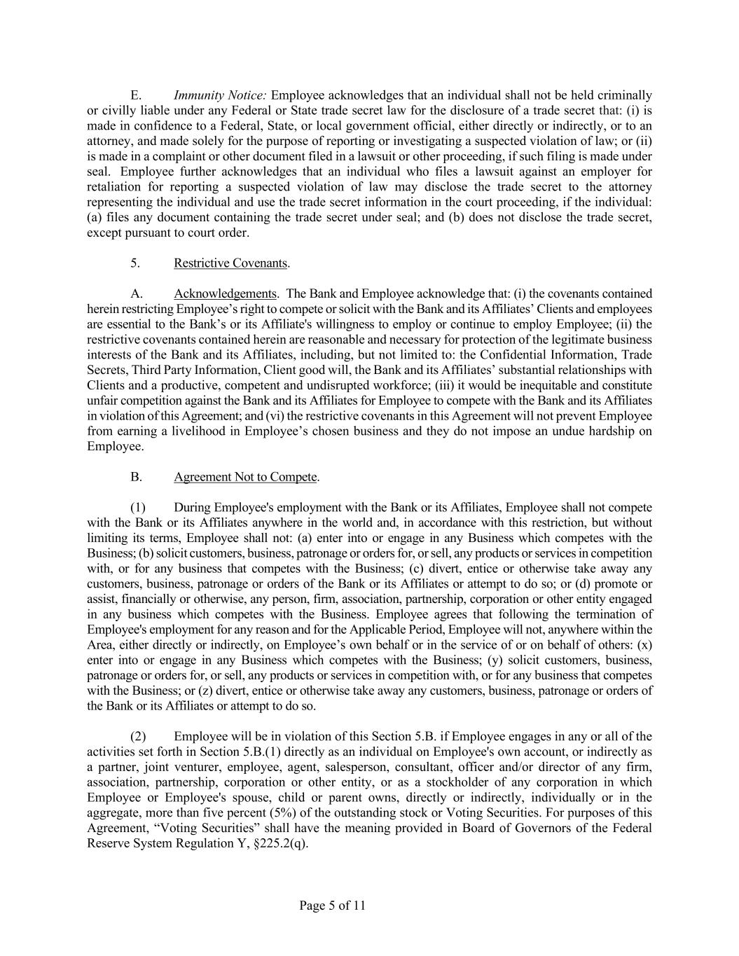 Page 5 of 11 E. Immunity Notice: Employee acknowledges that an individual shall not be held criminally or civilly liable under any Federal or State trade secret law for the disclosure of a trade secret that: (i) is made in confidence to a Federal, State, or local government official, either directly or indirectly, or to an attorney, and made solely for the purpose of reporting or investigating a suspected violation of law; or (ii) is made in a complaint or other document filed in a lawsuit or other proceeding, if such filing is made under seal. Employee further acknowledges that an individual who files a lawsuit against an employer for retaliation for reporting a suspected violation of law may disclose the trade secret to the attorney representing the individual and use the trade secret information in the court proceeding, if the individual: (a) files any document containing the trade secret under seal; and (b) does not disclose the trade secret, except pursuant to court order. 5. Restrictive Covenants. A. Acknowledgements. The Bank and Employee acknowledge that: (i) the covenants contained herein restricting Employee’s right to compete or solicit with the Bank and its Affiliates’ Clients and employees are essential to the Bank’s or its Affiliate's willingness to employ or continue to employ Employee; (ii) the restrictive covenants contained herein are reasonable and necessary for protection of the legitimate business interests of the Bank and its Affiliates, including, but not limited to: the Confidential Information, Trade Secrets, Third Party Information, Client good will, the Bank and its Affiliates’ substantial relationships with Clients and a productive, competent and undisrupted workforce; (iii) it would be inequitable and constitute unfair competition against the Bank and its Affiliates for Employee to compete with the Bank and its Affiliates in violation of this Agreement; and (vi) the restrictive covenants in this Agreement will not prevent Employee from earning a livelihood in Employee’s chosen business and they do not impose an undue hardship on Employee. B. Agreement Not to Compete. (1) During Employee's employment with the Bank or its Affiliates, Employee shall not compete with the Bank or its Affiliates anywhere in the world and, in accordance with this restriction, but without limiting its terms, Employee shall not: (a) enter into or engage in any Business which competes with the Business; (b) solicit customers, business, patronage or orders for, or sell, any products or services in competition with, or for any business that competes with the Business; (c) divert, entice or otherwise take away any customers, business, patronage or orders of the Bank or its Affiliates or attempt to do so; or (d) promote or assist, financially or otherwise, any person, firm, association, partnership, corporation or other entity engaged in any business which competes with the Business. Employee agrees that following the termination of Employee's employment for any reason and for the Applicable Period, Employee will not, anywhere within the Area, either directly or indirectly, on Employee’s own behalf or in the service of or on behalf of others: (x) enter into or engage in any Business which competes with the Business; (y) solicit customers, business, patronage or orders for, or sell, any products or services in competition with, or for any business that competes with the Business; or (z) divert, entice or otherwise take away any customers, business, patronage or orders of the Bank or its Affiliates or attempt to do so. (2) Employee will be in violation of this Section 5.B. if Employee engages in any or all of the activities set forth in Section 5.B.(1) directly as an individual on Employee's own account, or indirectly as a partner, joint venturer, employee, agent, salesperson, consultant, officer and/or director of any firm, association, partnership, corporation or other entity, or as a stockholder of any corporation in which Employee or Employee's spouse, child or parent owns, directly or indirectly, individually or in the aggregate, more than five percent (5%) of the outstanding stock or Voting Securities. For purposes of this Agreement, “Voting Securities” shall have the meaning provided in Board of Governors of the Federal Reserve System Regulation Y, §225.2(q).