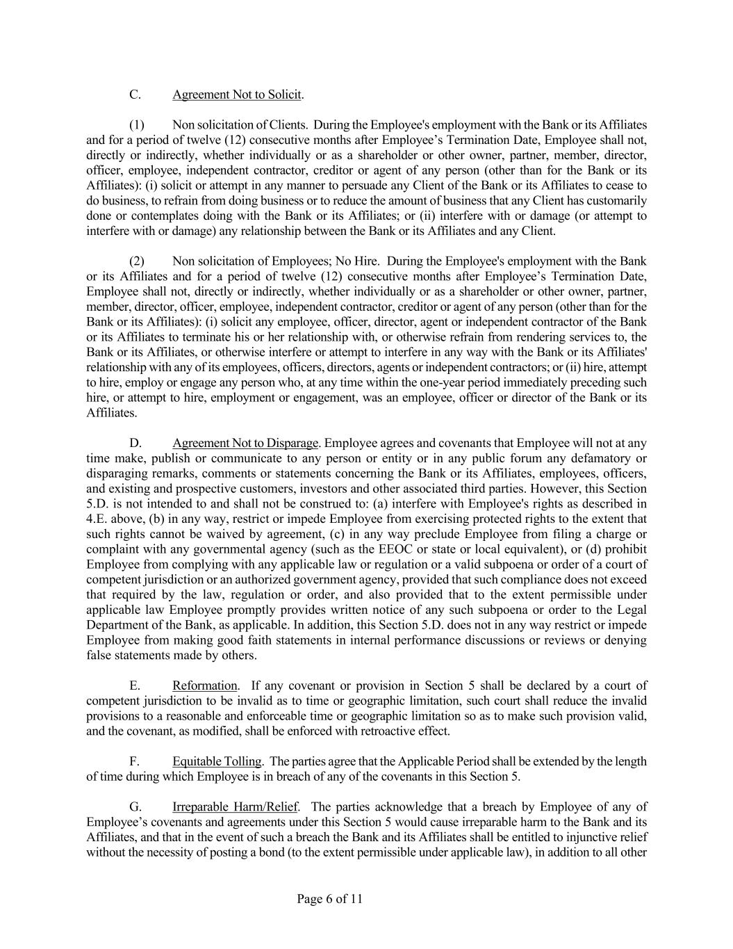 Page 6 of 11 C. Agreement Not to Solicit. (1) Non solicitation of Clients. During the Employee's employment with the Bank or its Affiliates and for a period of twelve (12) consecutive months after Employee’s Termination Date, Employee shall not, directly or indirectly, whether individually or as a shareholder or other owner, partner, member, director, officer, employee, independent contractor, creditor or agent of any person (other than for the Bank or its Affiliates): (i) solicit or attempt in any manner to persuade any Client of the Bank or its Affiliates to cease to do business, to refrain from doing business or to reduce the amount of business that any Client has customarily done or contemplates doing with the Bank or its Affiliates; or (ii) interfere with or damage (or attempt to interfere with or damage) any relationship between the Bank or its Affiliates and any Client. (2) Non solicitation of Employees; No Hire. During the Employee's employment with the Bank or its Affiliates and for a period of twelve (12) consecutive months after Employee’s Termination Date, Employee shall not, directly or indirectly, whether individually or as a shareholder or other owner, partner, member, director, officer, employee, independent contractor, creditor or agent of any person (other than for the Bank or its Affiliates): (i) solicit any employee, officer, director, agent or independent contractor of the Bank or its Affiliates to terminate his or her relationship with, or otherwise refrain from rendering services to, the Bank or its Affiliates, or otherwise interfere or attempt to interfere in any way with the Bank or its Affiliates' relationship with any of its employees, officers, directors, agents or independent contractors; or (ii) hire, attempt to hire, employ or engage any person who, at any time within the one-year period immediately preceding such hire, or attempt to hire, employment or engagement, was an employee, officer or director of the Bank or its Affiliates. D. Agreement Not to Disparage. Employee agrees and covenants that Employee will not at any time make, publish or communicate to any person or entity or in any public forum any defamatory or disparaging remarks, comments or statements concerning the Bank or its Affiliates, employees, officers, and existing and prospective customers, investors and other associated third parties. However, this Section 5.D. is not intended to and shall not be construed to: (a) interfere with Employee's rights as described in 4.E. above, (b) in any way, restrict or impede Employee from exercising protected rights to the extent that such rights cannot be waived by agreement, (c) in any way preclude Employee from filing a charge or complaint with any governmental agency (such as the EEOC or state or local equivalent), or (d) prohibit Employee from complying with any applicable law or regulation or a valid subpoena or order of a court of competent jurisdiction or an authorized government agency, provided that such compliance does not exceed that required by the law, regulation or order, and also provided that to the extent permissible under applicable law Employee promptly provides written notice of any such subpoena or order to the Legal Department of the Bank, as applicable. In addition, this Section 5.D. does not in any way restrict or impede Employee from making good faith statements in internal performance discussions or reviews or denying false statements made by others. E. Reformation. If any covenant or provision in Section 5 shall be declared by a court of competent jurisdiction to be invalid as to time or geographic limitation, such court shall reduce the invalid provisions to a reasonable and enforceable time or geographic limitation so as to make such provision valid, and the covenant, as modified, shall be enforced with retroactive effect. F. Equitable Tolling. The parties agree that the Applicable Period shall be extended by the length of time during which Employee is in breach of any of the covenants in this Section 5. G. Irreparable Harm/Relief. The parties acknowledge that a breach by Employee of any of Employee’s covenants and agreements under this Section 5 would cause irreparable harm to the Bank and its Affiliates, and that in the event of such a breach the Bank and its Affiliates shall be entitled to injunctive relief without the necessity of posting a bond (to the extent permissible under applicable law), in addition to all other