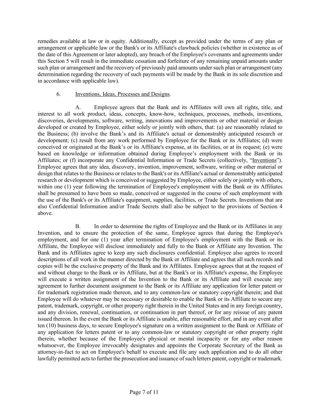 Page 7 of 11 remedies available at law or in equity. Additionally, except as provided under the terms of any plan or arrangement or applicable law or the Bank's or its Affiliate's clawback policies (whether in existence as of the date of this Agreement or later adopted), any breach of the Employee's covenants and agreements under this Section 5 will result in the immediate cessation and forfeiture of any remaining unpaid amounts under such plan or arrangement and the recovery of previously paid amounts under such plan or arrangement (any determination regarding the recovery of such payments will be made by the Bank in its sole discretion and in accordance with applicable law). 6. Inventions, Ideas, Processes and Designs. A. Employee agrees that the Bank and its Affiliates will own all rights, title, and interest to all work product, ideas, concepts, know-how, techniques, processes, methods, inventions, discoveries, developments, software, writing, innovations and improvements or other material or design developed or created by Employee, either solely or jointly with others, that: (a) are reasonably related to the Business; (b) involve the Bank’s and its Affiliate's actual or demonstrably anticipated research or development; (c) result from any work performed by Employee for the Bank or its Affiliates; (d) were conceived or originated at the Bank’s or its Affiliate's expense, at its facilities, or at its request; (e) were based on knowledge or information obtained during Employee’s employment with the Bank or its Affiliates; or (f) incorporate any Confidential Information or Trade Secrets (collectively, “Inventions”). Employee agrees that any idea, discovery, invention, improvement, software, writing or other material or design that relates to the Business or relates to the Bank's or its Affiliate's actual or demonstrably anticipated research or development which is conceived or suggested by Employee, either solely or jointly with others, within one (1) year following the termination of Employee's employment with the Bank or its Affiliates shall be presumed to have been so made, conceived or suggested in the course of such employment with the use of the Bank's or its Affiliate's equipment, supplies, facilities, or Trade Secrets. Inventions that are also Confidential Information and/or Trade Secrets shall also be subject to the provisions of Section 4 above. B. In order to determine the rights of Employee and the Bank or its Affiliates in any Invention, and to ensure the protection of the same, Employee agrees that during the Employee's employment, and for one (1) year after termination of Employee's employment with the Bank or its Affiliate, the Employee will disclose immediately and fully to the Bank or Affiliate any Invention. The Bank and its Affiliates agree to keep any such disclosures confidential. Employee also agrees to record descriptions of all work in the manner directed by the Bank or Affiliate and agrees that all such records and copies will be the exclusive property of the Bank and its Affiliates. Employee agrees that at the request of and without charge to the Bank or its Affiliate, but at the Bank's or its Affiliate's expense, the Employee will execute a written assignment of the Invention to the Bank or its Affiliate and will execute any agreement to further document assignment to the Bank or its Affiliate any application for letter patent or for trademark registration made thereon, and to any common-law or statutory copyright therein; and that Employee will do whatever may be necessary or desirable to enable the Bank or its Affiliate to secure any patent, trademark, copyright, or other property right therein in the United States and in any foreign country, and any division, renewal, continuation, or continuation in part thereof, or for any reissue of any patent issued thereon. In the event the Bank or its Affiliate is unable, after reasonable effort, and in any event after ten (10) business days, to secure Employee's signature on a written assignment to the Bank or Affiliate of any application for letters patent or to any common-law or statutory copyright or other property right therein, whether because of the Employee's physical or mental incapacity or for any other reason whatsoever, the Employee irrevocably designates and appoints the Corporate Secretary of the Bank as attorney-in-fact to act on Employee's behalf to execute and file any such application and to do all other lawfully permitted acts to further the prosecution and issuance of such letters patent, copyright or trademark.