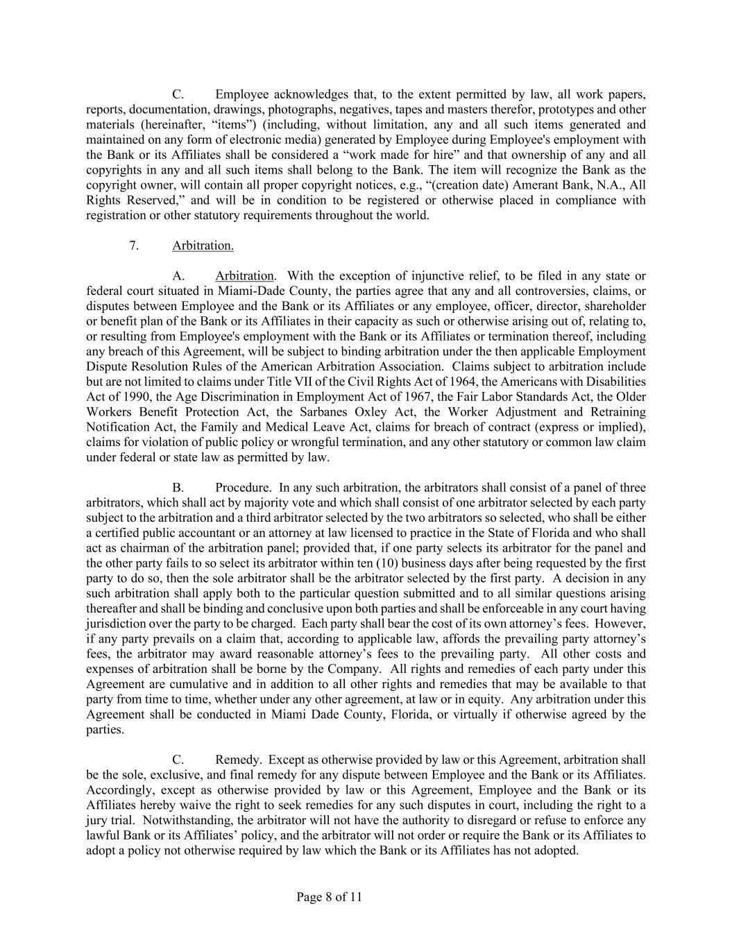 Page 8 of 11 C. Employee acknowledges that, to the extent permitted by law, all work papers, reports, documentation, drawings, photographs, negatives, tapes and masters therefor, prototypes and other materials (hereinafter, “items”) (including, without limitation, any and all such items generated and maintained on any form of electronic media) generated by Employee during Employee's employment with the Bank or its Affiliates shall be considered a “work made for hire” and that ownership of any and all copyrights in any and all such items shall belong to the Bank. The item will recognize the Bank as the copyright owner, will contain all proper copyright notices, e.g., “(creation date) Amerant Bank, N.A., All Rights Reserved,” and will be in condition to be registered or otherwise placed in compliance with registration or other statutory requirements throughout the world. 7. Arbitration. A. Arbitration. With the exception of injunctive relief, to be filed in any state or federal court situated in Miami-Dade County, the parties agree that any and all controversies, claims, or disputes between Employee and the Bank or its Affiliates or any employee, officer, director, shareholder or benefit plan of the Bank or its Affiliates in their capacity as such or otherwise arising out of, relating to, or resulting from Employee's employment with the Bank or its Affiliates or termination thereof, including any breach of this Agreement, will be subject to binding arbitration under the then applicable Employment Dispute Resolution Rules of the American Arbitration Association. Claims subject to arbitration include but are not limited to claims under Title VII of the Civil Rights Act of 1964, the Americans with Disabilities Act of 1990, the Age Discrimination in Employment Act of 1967, the Fair Labor Standards Act, the Older Workers Benefit Protection Act, the Sarbanes Oxley Act, the Worker Adjustment and Retraining Notification Act, the Family and Medical Leave Act, claims for breach of contract (express or implied), claims for violation of public policy or wrongful termination, and any other statutory or common law claim under federal or state law as permitted by law. B. Procedure. In any such arbitration, the arbitrators shall consist of a panel of three arbitrators, which shall act by majority vote and which shall consist of one arbitrator selected by each party subject to the arbitration and a third arbitrator selected by the two arbitrators so selected, who shall be either a certified public accountant or an attorney at law licensed to practice in the State of Florida and who shall act as chairman of the arbitration panel; provided that, if one party selects its arbitrator for the panel and the other party fails to so select its arbitrator within ten (10) business days after being requested by the first party to do so, then the sole arbitrator shall be the arbitrator selected by the first party. A decision in any such arbitration shall apply both to the particular question submitted and to all similar questions arising thereafter and shall be binding and conclusive upon both parties and shall be enforceable in any court having jurisdiction over the party to be charged. Each party shall bear the cost of its own attorney’s fees. However, if any party prevails on a claim that, according to applicable law, affords the prevailing party attorney’s fees, the arbitrator may award reasonable attorney’s fees to the prevailing party. All other costs and expenses of arbitration shall be borne by the Company. All rights and remedies of each party under this Agreement are cumulative and in addition to all other rights and remedies that may be available to that party from time to time, whether under any other agreement, at law or in equity. Any arbitration under this Agreement shall be conducted in Miami Dade County, Florida, or virtually if otherwise agreed by the parties. C. Remedy. Except as otherwise provided by law or this Agreement, arbitration shall be the sole, exclusive, and final remedy for any dispute between Employee and the Bank or its Affiliates. Accordingly, except as otherwise provided by law or this Agreement, Employee and the Bank or its Affiliates hereby waive the right to seek remedies for any such disputes in court, including the right to a jury trial. Notwithstanding, the arbitrator will not have the authority to disregard or refuse to enforce any lawful Bank or its Affiliates’ policy, and the arbitrator will not order or require the Bank or its Affiliates to adopt a policy not otherwise required by law which the Bank or its Affiliates has not adopted.
