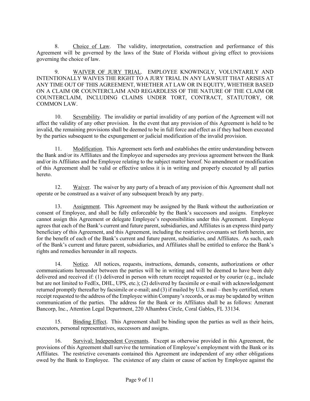 Page 9 of 11 8. Choice of Law. The validity, interpretation, construction and performance of this Agreement will be governed by the laws of the State of Florida without giving effect to provisions governing the choice of law. 9. WAIVER OF JURY TRIAL. EMPLOYEE KNOWINGLY, VOLUNTARILY AND INTENTIONALLY WAIVES THE RIGHT TO A JURY TRIAL IN ANY LAWSUIT THAT ARISES AT ANY TIME OUT OF THIS AGREEMENT, WHETHER AT LAW OR IN EQUITY, WHETHER BASED ON A CLAIM OR COUNTERCLAIM AND REGARDLESS OF THE NATURE OF THE CLAIM OR COUNTERCLAIM, INCLUDING CLAIMS UNDER TORT, CONTRACT, STATUTORY, OR COMMON LAW. 10. Severability. The invalidity or partial invalidity of any portion of the Agreement will not affect the validity of any other provision. In the event that any provision of this Agreement is held to be invalid, the remaining provisions shall be deemed to be in full force and effect as if they had been executed by the parties subsequent to the expungement or judicial modification of the invalid provision. 11. Modification. This Agreement sets forth and establishes the entire understanding between the Bank and/or its Affiliates and the Employee and supersedes any previous agreement between the Bank and/or its Affiliates and the Employee relating to the subject matter hereof. No amendment or modification of this Agreement shall be valid or effective unless it is in writing and properly executed by all parties hereto. 12. Waiver. The waiver by any party of a breach of any provision of this Agreement shall not operate or be construed as a waiver of any subsequent breach by any party. 13. Assignment. This Agreement may be assigned by the Bank without the authorization or consent of Employee, and shall be fully enforceable by the Bank’s successors and assigns. Employee cannot assign this Agreement or delegate Employee’s responsibilities under this Agreement. Employee agrees that each of the Bank’s current and future parent, subsidiaries, and Affiliates is an express third party beneficiary of this Agreement, and this Agreement, including the restrictive covenants set forth herein, are for the benefit of each of the Bank’s current and future parent, subsidiaries, and Affiliates. As such, each of the Bank’s current and future parent, subsidiaries, and Affiliates shall be entitled to enforce the Bank’s rights and remedies hereunder in all respects. 14. Notice. All notices, requests, instructions, demands, consents, authorizations or other communications hereunder between the parties will be in writing and will be deemed to have been duly delivered and received if: (1) delivered in person with return receipt requested or by courier (e.g., include but are not limited to FedEx, DHL, UPS, etc.); (2) delivered by facsimile or e-mail with acknowledgement returned promptly thereafter by facsimile or e-mail; and (3) if mailed by U.S. mail – then by certified, return receipt requested to the address of the Employee within Company’s records, or as may be updated by written communication of the parties. The address for the Bank or its Affiliates shall be as follows: Amerant Bancorp, Inc., Attention Legal Department, 220 Alhambra Circle, Coral Gables, FL 33134. 15. Binding Effect. This Agreement shall be binding upon the parties as well as their heirs, executors, personal representatives, successors and assigns. 16. Survival; Independent Covenants. Except as otherwise provided in this Agreement, the provisions of this Agreement shall survive the termination of Employee’s employment with the Bank or its Affiliates. The restrictive covenants contained this Agreement are independent of any other obligations owed by the Bank to Employee. The existence of any claim or cause of action by Employee against the