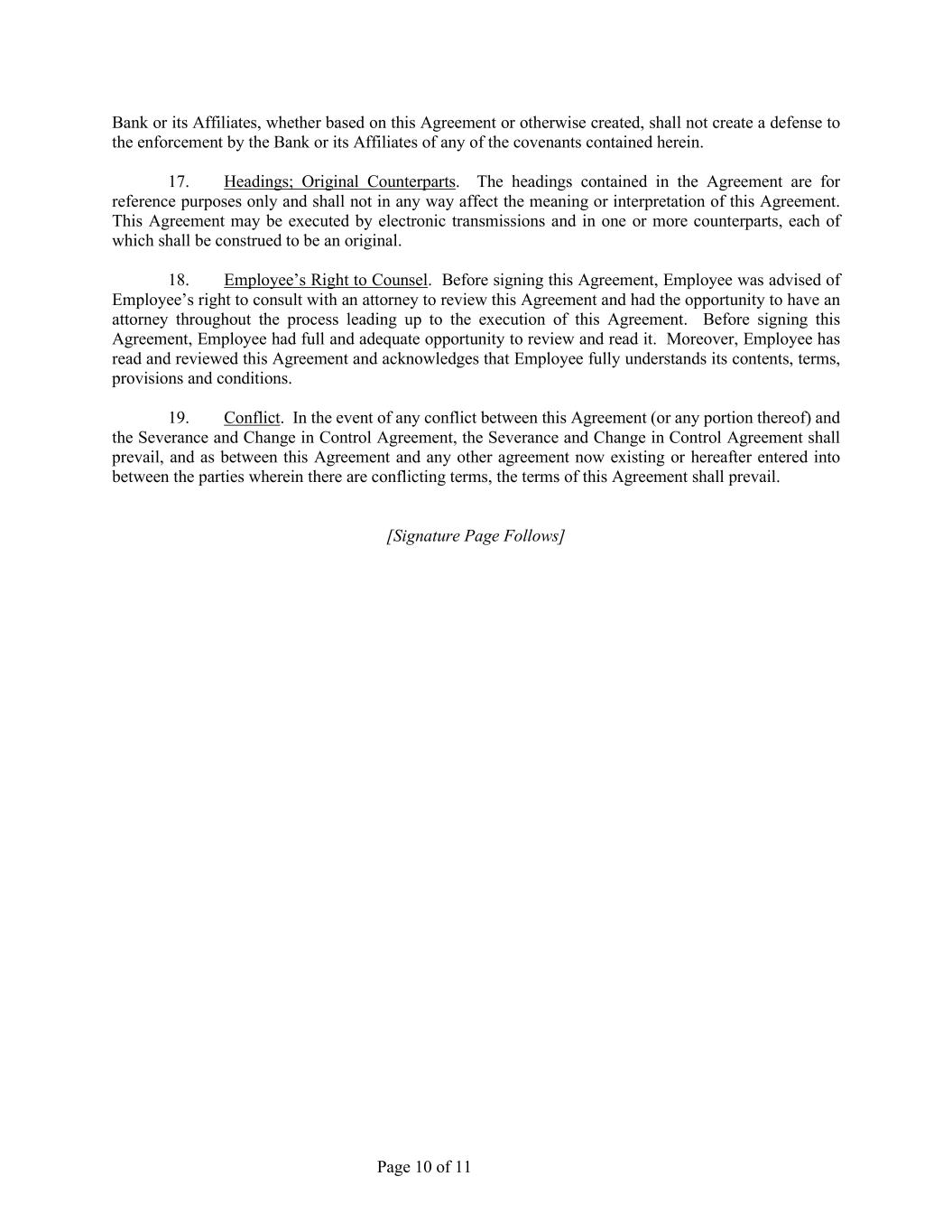 Page 10 of 11 Bank or its Affiliates, whether based on this Agreement or otherwise created, shall not create a defense to the enforcement by the Bank or its Affiliates of any of the covenants contained herein. 17. Headings; Original Counterparts. The headings contained in the Agreement are for reference purposes only and shall not in any way affect the meaning or interpretation of this Agreement. This Agreement may be executed by electronic transmissions and in one or more counterparts, each of which shall be construed to be an original. 18. Employee’s Right to Counsel. Before signing this Agreement, Employee was advised of Employee’s right to consult with an attorney to review this Agreement and had the opportunity to have an attorney throughout the process leading up to the execution of this Agreement. Before signing this Agreement, Employee had full and adequate opportunity to review and read it. Moreover, Employee has read and reviewed this Agreement and acknowledges that Employee fully understands its contents, terms, provisions and conditions. 19. Conflict. In the event of any conflict between this Agreement (or any portion thereof) and the Severance and Change in Control Agreement, the Severance and Change in Control Agreement shall prevail, and as between this Agreement and any other agreement now existing or hereafter entered into between the parties wherein there are conflicting terms, the terms of this Agreement shall prevail. [Signature Page Follows]