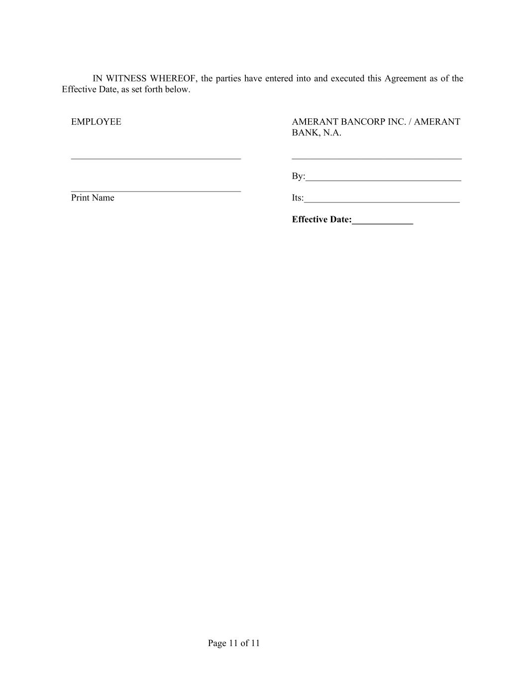 Page 11 of 11 IN WITNESS WHEREOF, the parties have entered into and executed this Agreement as of the Effective Date, as set forth below. EMPLOYEE ____________________________________ ____________________________________ Print Name AMERANT BANCORP INC. / AMERANT BANK, N.A. ____________________________________ By:_________________________________ Its:_________________________________ Effective Date:_____________