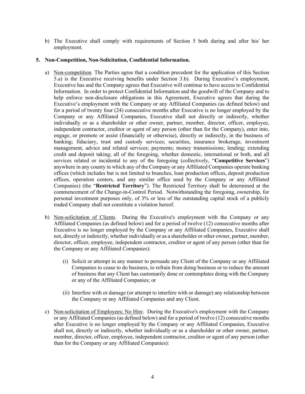 4 b) The Executive shall comply with requirements of Section 5 both during and after his/ her employment. 5. Non-Competition, Non-Solicitation, Confidential Information. a) Non-competition. The Parties agree that a condition precedent for the application of this Section 5.a) is the Executive receiving benefits under Section 3.b). During Executive’s employment, Executive has and the Company agrees that Executive will continue to have access to Confidential Information. In order to protect Confidential Information and the goodwill of the Company and to help enforce non-disclosure obligations in this Agreement, Executive agrees that during the Executive’s employment with the Company or any Affiliated Companies (as defined below) and for a period of twenty four (24) consecutive months after Executive is no longer employed by the Company or any Affiliated Companies, Executive shall not directly or indirectly, whether individually or as a shareholder or other owner, partner, member, director, officer, employee, independent contractor, creditor or agent of any person (other than for the Company), enter into, engage, or promote or assist (financially or otherwise), directly or indirectly, in the business of banking; fiduciary, trust and custody services; securities, insurance brokerage, investment management, advice and related services; payments; money transmissions; lending; extending credit and deposit taking; all of the foregoing, whether domestic, international or both, and all services related or incidental to any of the foregoing (collectively, “Competitive Services”) anywhere in any county in which any of the Company or any Affiliated Companies operate banking offices (which includes but is not limited to branches, loan production offices, deposit production offices, operation centers, and any similar office used by the Company or any Affiliated Companies) (the “Restricted Territory”). The Restricted Territory shall be determined at the commencement of the Change-in-Control Period. Notwithstanding the foregoing, ownership, for personal investment purposes only, of 3% or less of the outstanding capital stock of a publicly traded Company shall not constitute a violation hereof. b) Non-solicitation of Clients. During the Executive's employment with the Company or any Affiliated Companies (as defined below) and for a period of twelve (12) consecutive months after Executive is no longer employed by the Company or any Affiliated Companies, Executive shall not, directly or indirectly, whether individually or as a shareholder or other owner, partner, member, director, officer, employee, independent contractor, creditor or agent of any person (other than for the Company or any Affiliated Companies): (i) Solicit or attempt in any manner to persuade any Client of the Company or any Affiliated Companies to cease to do business, to refrain from doing business or to reduce the amount of business that any Client has customarily done or contemplates doing with the Company or any of the Affiliated Companies; or (ii) Interfere with or damage (or attempt to interfere with or damage) any relationship between the Company or any Affiliated Companies and any Client. c) Non-solicitation of Employees; No Hire. During the Executive's employment with the Company or any Affiliated Companies (as defined below) and for a period of twelve (12) consecutive months after Executive is no longer employed by the Company or any Affiliated Companies, Executive shall not, directly or indirectly, whether individually or as a shareholder or other owner, partner, member, director, officer, employee, independent contractor, creditor or agent of any person (other than for the Company or any Affiliated Companies):