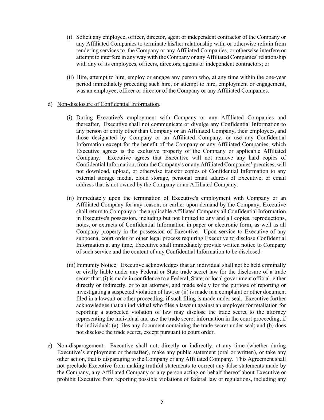 5 (i) Solicit any employee, officer, director, agent or independent contractor of the Company or any Affiliated Companies to terminate his/her relationship with, or otherwise refrain from rendering services to, the Company or any Affiliated Companies, or otherwise interfere or attempt to interfere in any way with the Company or any Affiliated Companies' relationship with any of its employees, officers, directors, agents or independent contractors; or (ii) Hire, attempt to hire, employ or engage any person who, at any time within the one-year period immediately preceding such hire, or attempt to hire, employment or engagement, was an employee, officer or director of the Company or any Affiliated Companies. d) Non-disclosure of Confidential Information. (i) During Executive's employment with Company or any Affiliated Companies and thereafter, Executive shall not communicate or divulge any Confidential Information to any person or entity other than Company or an Affiliated Company, their employees, and those designated by Company or an Affiliated Company, or use any Confidential Information except for the benefit of the Company or any Affiliated Companies, which Executive agrees is the exclusive property of the Company or applicable Affiliated Company. Executive agrees that Executive will not remove any hard copies of Confidential Information, from the Company's or any Affiliated Companies’ premises, will not download, upload, or otherwise transfer copies of Confidential Information to any external storage media, cloud storage, personal email address of Executive, or email address that is not owned by the Company or an Affiliated Company. (ii) Immediately upon the termination of Executive's employment with Company or an Affiliated Company for any reason, or earlier upon demand by the Company, Executive shall return to Company or the applicable Affiliated Company all Confidential Information in Executive's possession, including but not limited to any and all copies, reproductions, notes, or extracts of Confidential Information in paper or electronic form, as well as all Company property in the possession of Executive. Upon service to Executive of any subpoena, court order or other legal process requiring Executive to disclose Confidential Information at any time, Executive shall immediately provide written notice to Company of such service and the content of any Confidential Information to be disclosed. (iii) Immunity Notice: Executive acknowledges that an individual shall not be held criminally or civilly liable under any Federal or State trade secret law for the disclosure of a trade secret that: (i) is made in confidence to a Federal, State, or local government official, either directly or indirectly, or to an attorney, and made solely for the purpose of reporting or investigating a suspected violation of law; or (ii) is made in a complaint or other document filed in a lawsuit or other proceeding, if such filing is made under seal. Executive further acknowledges that an individual who files a lawsuit against an employer for retaliation for reporting a suspected violation of law may disclose the trade secret to the attorney representing the individual and use the trade secret information in the court proceeding, if the individual: (a) files any document containing the trade secret under seal; and (b) does not disclose the trade secret, except pursuant to court order. e) Non-disparagement. Executive shall not, directly or indirectly, at any time (whether during Executive’s employment or thereafter), make any public statement (oral or written), or take any other action, that is disparaging to the Company or any Affiliated Company. This Agreement shall not preclude Executive from making truthful statements to correct any false statements made by the Company, any Affiliated Company or any person acting on behalf thereof about Executive or prohibit Executive from reporting possible violations of federal law or regulations, including any