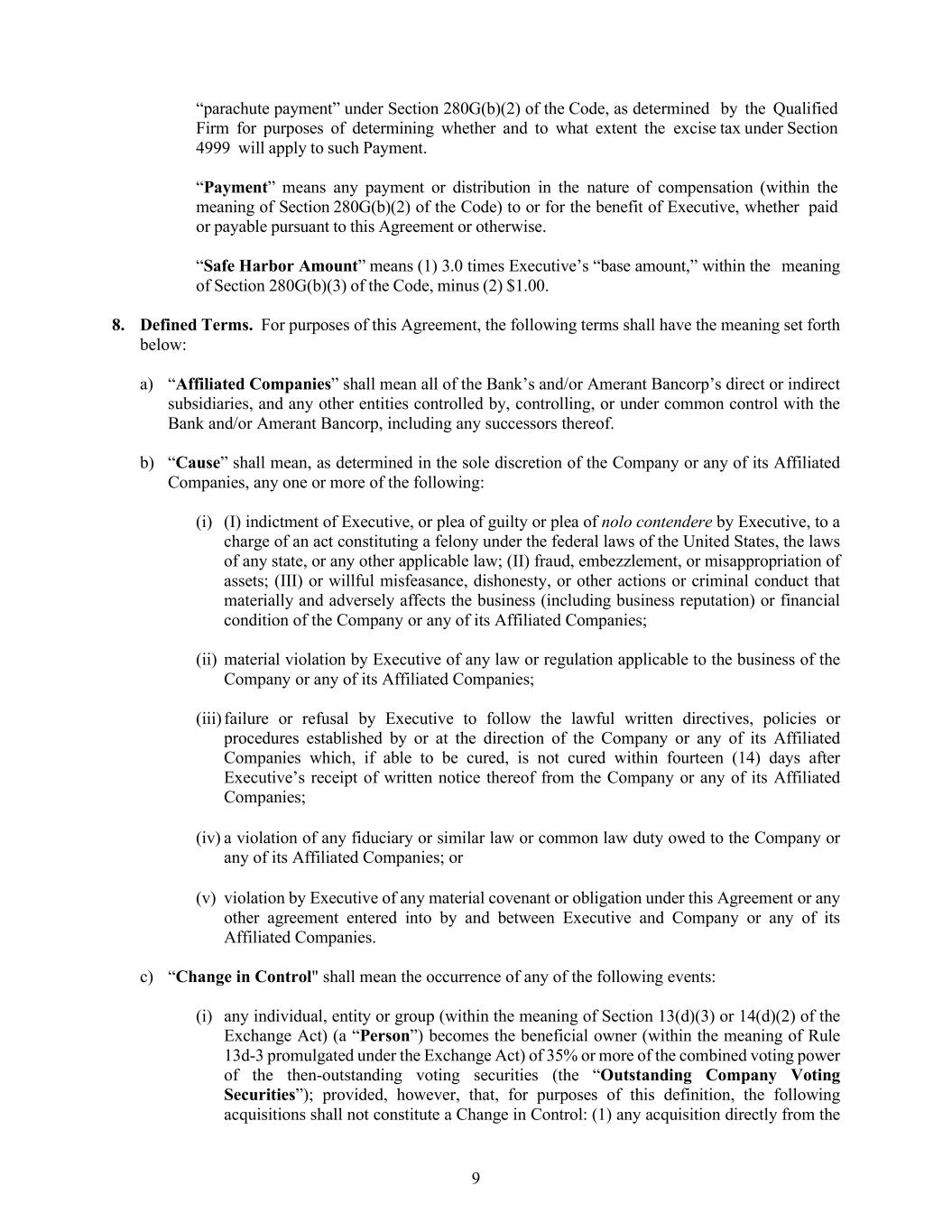 9 “parachute payment” under Section 280G(b)(2) of the Code, as determined by the Qualified Firm for purposes of determining whether and to what extent the excise tax under Section 4999 will apply to such Payment. “Payment” means any payment or distribution in the nature of compensation (within the meaning of Section 280G(b)(2) of the Code) to or for the benefit of Executive, whether paid or payable pursuant to this Agreement or otherwise. “Safe Harbor Amount” means (1) 3.0 times Executive’s “base amount,” within the meaning of Section 280G(b)(3) of the Code, minus (2) $1.00. 8. Defined Terms. For purposes of this Agreement, the following terms shall have the meaning set forth below: a) “Affiliated Companies” shall mean all of the Bank’s and/or Amerant Bancorp’s direct or indirect subsidiaries, and any other entities controlled by, controlling, or under common control with the Bank and/or Amerant Bancorp, including any successors thereof. b) “Cause” shall mean, as determined in the sole discretion of the Company or any of its Affiliated Companies, any one or more of the following: (i) (I) indictment of Executive, or plea of guilty or plea of nolo contendere by Executive, to a charge of an act constituting a felony under the federal laws of the United States, the laws of any state, or any other applicable law; (II) fraud, embezzlement, or misappropriation of assets; (III) or willful misfeasance, dishonesty, or other actions or criminal conduct that materially and adversely affects the business (including business reputation) or financial condition of the Company or any of its Affiliated Companies; (ii) material violation by Executive of any law or regulation applicable to the business of the Company or any of its Affiliated Companies; (iii) failure or refusal by Executive to follow the lawful written directives, policies or procedures established by or at the direction of the Company or any of its Affiliated Companies which, if able to be cured, is not cured within fourteen (14) days after Executive’s receipt of written notice thereof from the Company or any of its Affiliated Companies; (iv) a violation of any fiduciary or similar law or common law duty owed to the Company or any of its Affiliated Companies; or (v) violation by Executive of any material covenant or obligation under this Agreement or any other agreement entered into by and between Executive and Company or any of its Affiliated Companies. c) “Change in Control" shall mean the occurrence of any of the following events: (i) any individual, entity or group (within the meaning of Section 13(d)(3) or 14(d)(2) of the Exchange Act) (a “Person”) becomes the beneficial owner (within the meaning of Rule 13d-3 promulgated under the Exchange Act) of 35% or more of the combined voting power of the then-outstanding voting securities (the “Outstanding Company Voting Securities”); provided, however, that, for purposes of this definition, the following acquisitions shall not constitute a Change in Control: (1) any acquisition directly from the