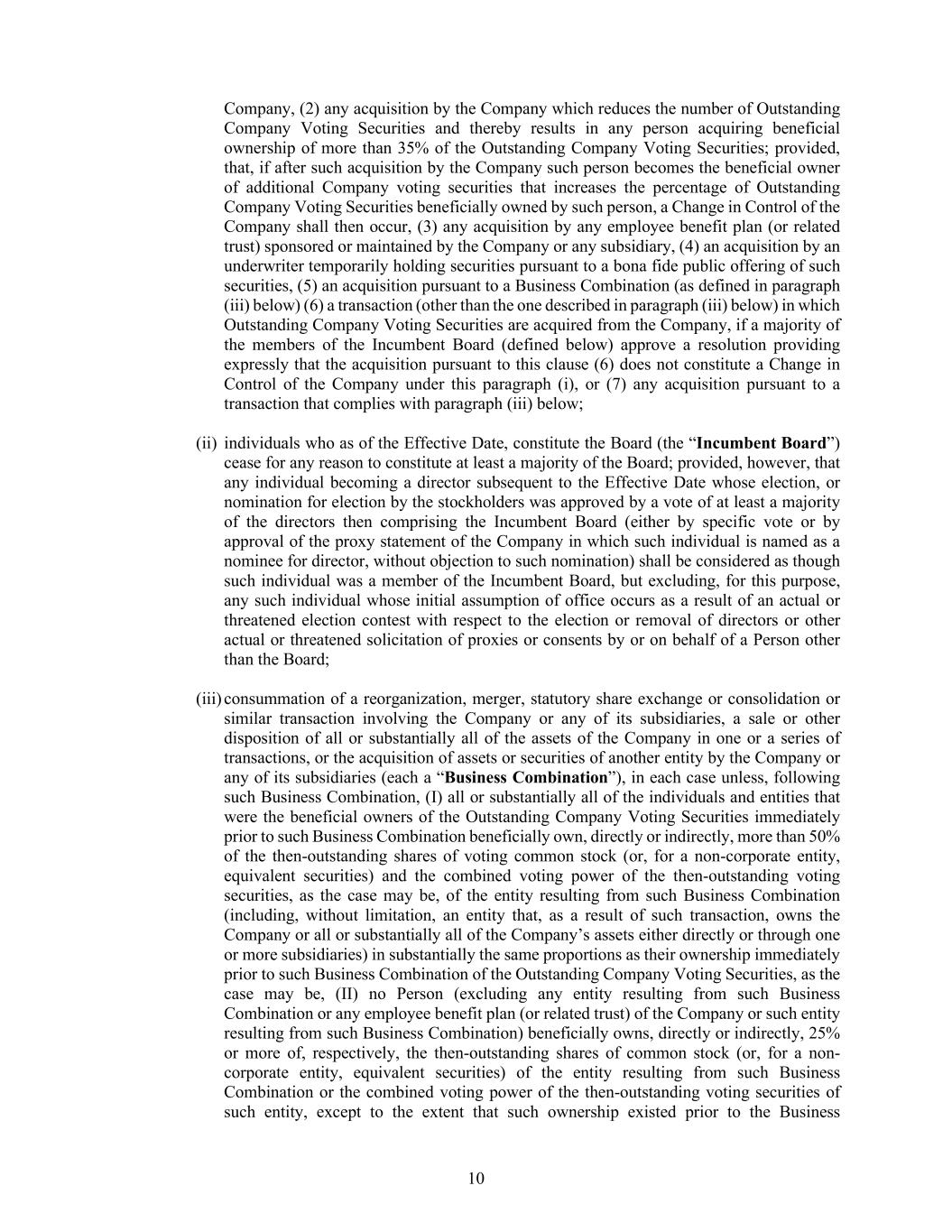 10 Company, (2) any acquisition by the Company which reduces the number of Outstanding Company Voting Securities and thereby results in any person acquiring beneficial ownership of more than 35% of the Outstanding Company Voting Securities; provided, that, if after such acquisition by the Company such person becomes the beneficial owner of additional Company voting securities that increases the percentage of Outstanding Company Voting Securities beneficially owned by such person, a Change in Control of the Company shall then occur, (3) any acquisition by any employee benefit plan (or related trust) sponsored or maintained by the Company or any subsidiary, (4) an acquisition by an underwriter temporarily holding securities pursuant to a bona fide public offering of such securities, (5) an acquisition pursuant to a Business Combination (as defined in paragraph (iii) below) (6) a transaction (other than the one described in paragraph (iii) below) in which Outstanding Company Voting Securities are acquired from the Company, if a majority of the members of the Incumbent Board (defined below) approve a resolution providing expressly that the acquisition pursuant to this clause (6) does not constitute a Change in Control of the Company under this paragraph (i), or (7) any acquisition pursuant to a transaction that complies with paragraph (iii) below; (ii) individuals who as of the Effective Date, constitute the Board (the “Incumbent Board”) cease for any reason to constitute at least a majority of the Board; provided, however, that any individual becoming a director subsequent to the Effective Date whose election, or nomination for election by the stockholders was approved by a vote of at least a majority of the directors then comprising the Incumbent Board (either by specific vote or by approval of the proxy statement of the Company in which such individual is named as a nominee for director, without objection to such nomination) shall be considered as though such individual was a member of the Incumbent Board, but excluding, for this purpose, any such individual whose initial assumption of office occurs as a result of an actual or threatened election contest with respect to the election or removal of directors or other actual or threatened solicitation of proxies or consents by or on behalf of a Person other than the Board; (iii) consummation of a reorganization, merger, statutory share exchange or consolidation or similar transaction involving the Company or any of its subsidiaries, a sale or other disposition of all or substantially all of the assets of the Company in one or a series of transactions, or the acquisition of assets or securities of another entity by the Company or any of its subsidiaries (each a “Business Combination”), in each case unless, following such Business Combination, (I) all or substantially all of the individuals and entities that were the beneficial owners of the Outstanding Company Voting Securities immediately prior to such Business Combination beneficially own, directly or indirectly, more than 50% of the then-outstanding shares of voting common stock (or, for a non-corporate entity, equivalent securities) and the combined voting power of the then-outstanding voting securities, as the case may be, of the entity resulting from such Business Combination (including, without limitation, an entity that, as a result of such transaction, owns the Company or all or substantially all of the Company’s assets either directly or through one or more subsidiaries) in substantially the same proportions as their ownership immediately prior to such Business Combination of the Outstanding Company Voting Securities, as the case may be, (II) no Person (excluding any entity resulting from such Business Combination or any employee benefit plan (or related trust) of the Company or such entity resulting from such Business Combination) beneficially owns, directly or indirectly, 25% or more of, respectively, the then-outstanding shares of common stock (or, for a non- corporate entity, equivalent securities) of the entity resulting from such Business Combination or the combined voting power of the then-outstanding voting securities of such entity, except to the extent that such ownership existed prior to the Business