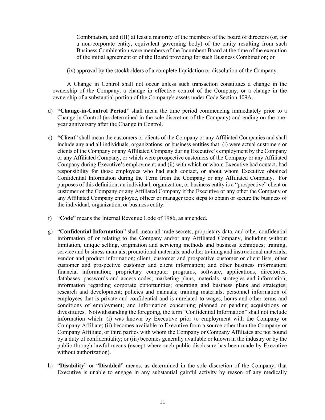 11 Combination, and (III) at least a majority of the members of the board of directors (or, for a non-corporate entity, equivalent governing body) of the entity resulting from such Business Combination were members of the Incumbent Board at the time of the execution of the initial agreement or of the Board providing for such Business Combination; or (iv) approval by the stockholders of a complete liquidation or dissolution of the Company. A Change in Control shall not occur unless such transaction constitutes a change in the ownership of the Company, a change in effective control of the Company, or a change in the ownership of a substantial portion of the Company's assets under Code Section 409A. d) “Change-in-Control Period” shall mean the time period commencing immediately prior to a Change in Control (as determined in the sole discretion of the Company) and ending on the one- year anniversary after the Change in Control. e) “Client” shall mean the customers or clients of the Company or any Affiliated Companies and shall include any and all individuals, organizations, or business entities that: (i) were actual customers or clients of the Company or any Affiliated Company during Executive’s employment by the Company or any Affiliated Company, or which were prospective customers of the Company or any Affiliated Company during Executive’s employment; and (ii) with which or whom Executive had contact, had responsibility for those employees who had such contact, or about whom Executive obtained Confidential Information during the Term from the Company or any Affiliated Company. For purposes of this definition, an individual, organization, or business entity is a “prospective” client or customer of the Company or any Affiliated Company if the Executive or any other the Company or any Affiliated Company employee, officer or manager took steps to obtain or secure the business of the individual, organization, or business entity. f) “Code” means the Internal Revenue Code of 1986, as amended. g) “Confidential Information” shall mean all trade secrets, proprietary data, and other confidential information of or relating to the Company and/or any Affiliated Company, including without limitation, unique selling, origination and servicing methods and business techniques; training, service and business manuals; promotional materials, and other training and instructional materials; vendor and product information; client, customer and prospective customer or client lists, other customer and prospective customer and client information; and other business information; financial information; proprietary computer programs, software, applications, directories, databases, passwords and access codes; marketing plans, materials, strategies and information; information regarding corporate opportunities; operating and business plans and strategies; research and development; policies and manuals; training materials; personnel information of employees that is private and confidential and is unrelated to wages, hours and other terms and conditions of employment; and information concerning planned or pending acquisitions or divestitures. Notwithstanding the foregoing, the term “Confidential Information” shall not include information which: (i) was known by Executive prior to employment with the Company or Company Affiliate; (ii) becomes available to Executive from a source other than the Company or Company Affiliate, or third parties with whom the Company or Company Affiliates are not bound by a duty of confidentiality; or (iii) becomes generally available or known in the industry or by the public through lawful means (except where such public disclosure has been made by Executive without authorization). h) “Disability” or “Disabled” means, as determined in the sole discretion of the Company, that Executive is unable to engage in any substantial gainful activity by reason of any medically