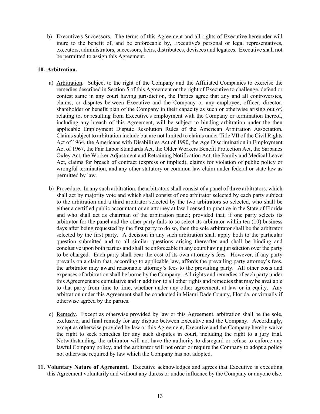 13 b) Executive's Successors. The terms of this Agreement and all rights of Executive hereunder will inure to the benefit of, and be enforceable by, Executive's personal or legal representatives, executors, administrators, successors, heirs, distributees, devisees and legatees. Executive shall not be permitted to assign this Agreement. 10. Arbitration. a) Arbitration. Subject to the right of the Company and the Affiliated Companies to exercise the remedies described in Section 5 of this Agreement or the right of Executive to challenge, defend or contest same in any court having jurisdiction, the Parties agree that any and all controversies, claims, or disputes between Executive and the Company or any employee, officer, director, shareholder or benefit plan of the Company in their capacity as such or otherwise arising out of, relating to, or resulting from Executive's employment with the Company or termination thereof, including any breach of this Agreement, will be subject to binding arbitration under the then applicable Employment Dispute Resolution Rules of the American Arbitration Association. Claims subject to arbitration include but are not limited to claims under Title VII of the Civil Rights Act of 1964, the Americans with Disabilities Act of 1990, the Age Discrimination in Employment Act of 1967, the Fair Labor Standards Act, the Older Workers Benefit Protection Act, the Sarbanes Oxley Act, the Worker Adjustment and Retraining Notification Act, the Family and Medical Leave Act, claims for breach of contract (express or implied), claims for violation of public policy or wrongful termination, and any other statutory or common law claim under federal or state law as permitted by law. b) Procedure. In any such arbitration, the arbitrators shall consist of a panel of three arbitrators, which shall act by majority vote and which shall consist of one arbitrator selected by each party subject to the arbitration and a third arbitrator selected by the two arbitrators so selected, who shall be either a certified public accountant or an attorney at law licensed to practice in the State of Florida and who shall act as chairman of the arbitration panel; provided that, if one party selects its arbitrator for the panel and the other party fails to so select its arbitrator within ten (10) business days after being requested by the first party to do so, then the sole arbitrator shall be the arbitrator selected by the first party. A decision in any such arbitration shall apply both to the particular question submitted and to all similar questions arising thereafter and shall be binding and conclusive upon both parties and shall be enforceable in any court having jurisdiction over the party to be charged. Each party shall bear the cost of its own attorney’s fees. However, if any party prevails on a claim that, according to applicable law, affords the prevailing party attorney’s fees, the arbitrator may award reasonable attorney’s fees to the prevailing party. All other costs and expenses of arbitration shall be borne by the Company. All rights and remedies of each party under this Agreement are cumulative and in addition to all other rights and remedies that may be available to that party from time to time, whether under any other agreement, at law or in equity. Any arbitration under this Agreement shall be conducted in Miami Dade County, Florida, or virtually if otherwise agreed by the parties. c) Remedy. Except as otherwise provided by law or this Agreement, arbitration shall be the sole, exclusive, and final remedy for any dispute between Executive and the Company. Accordingly, except as otherwise provided by law or this Agreement, Executive and the Company hereby waive the right to seek remedies for any such disputes in court, including the right to a jury trial. Notwithstanding, the arbitrator will not have the authority to disregard or refuse to enforce any lawful Company policy, and the arbitrator will not order or require the Company to adopt a policy not otherwise required by law which the Company has not adopted. 11. Voluntary Nature of Agreement. Executive acknowledges and agrees that Executive is executing this Agreement voluntarily and without any duress or undue influence by the Company or anyone else.