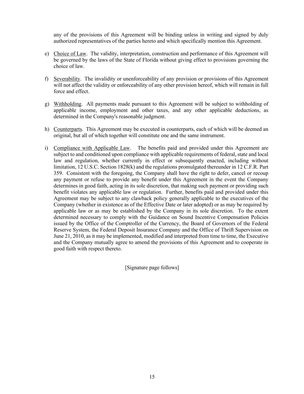 15 any of the provisions of this Agreement will be binding unless in writing and signed by duly authorized representatives of the parties hereto and which specifically mention this Agreement. e) Choice of Law. The validity, interpretation, construction and performance of this Agreement will be governed by the laws of the State of Florida without giving effect to provisions governing the choice of law. f) Severability. The invalidity or unenforceability of any provision or provisions of this Agreement will not affect the validity or enforceability of any other provision hereof, which will remain in full force and effect. g) Withholding. All payments made pursuant to this Agreement will be subject to withholding of applicable income, employment and other taxes, and any other applicable deductions, as determined in the Company's reasonable judgment. h) Counterparts. This Agreement may be executed in counterparts, each of which will be deemed an original, but all of which together will constitute one and the same instrument. i) Compliance with Applicable Law. The benefits paid and provided under this Agreement are subject to and conditioned upon compliance with applicable requirements of federal, state and local law and regulation, whether currently in effect or subsequently enacted, including without limitation, 12 U.S.C. Section 1828(k) and the regulations promulgated thereunder in 12 C.F.R. Part 359. Consistent with the foregoing, the Company shall have the right to defer, cancel or recoup any payment or refuse to provide any benefit under this Agreement in the event the Company determines in good faith, acting in its sole discretion, that making such payment or providing such benefit violates any applicable law or regulation. Further, benefits paid and provided under this Agreement may be subject to any clawback policy generally applicable to the executives of the Company (whether in existence as of the Effective Date or later adopted) or as may be required by applicable law or as may be established by the Company in its sole discretion. To the extent determined necessary to comply with the Guidance on Sound Incentive Compensation Policies issued by the Office of the Comptroller of the Currency, the Board of Governors of the Federal Reserve System, the Federal Deposit Insurance Company and the Office of Thrift Supervision on June 21, 2010, as it may be implemented, modified and interpreted from time to time, the Executive and the Company mutually agree to amend the provisions of this Agreement and to cooperate in good faith with respect thereto. [Signature page follows]