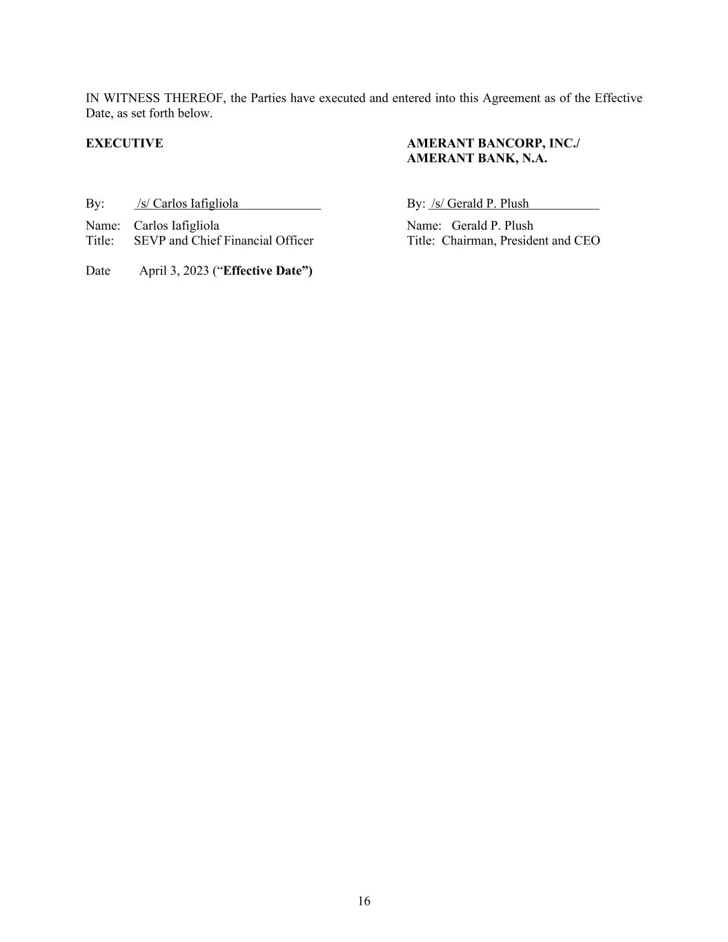 16 IN WITNESS THEREOF, the Parties have executed and entered into this Agreement as of the Effective Date, as set forth below. EXECUTIVE AMERANT BANCORP, INC./ AMERANT BANK, N.A. By: /s/ Carlos Iafigliola By: /s/ Gerald P. Plush Name: Carlos Iafigliola Name: Gerald P. Plush Title: SEVP and Chief Financial Officer Title: Chairman, President and CEO Date April 3, 2023 (“Effective Date”)