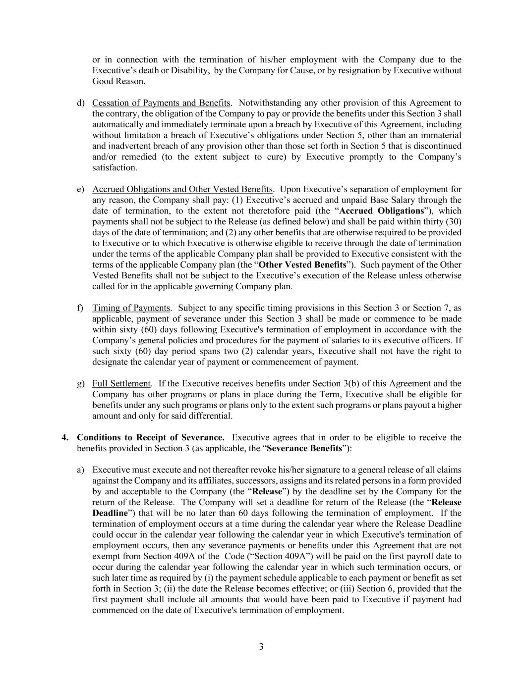 3 or in connection with the termination of his/her employment with the Company due to the Executive’s death or Disability, by the Company for Cause, or by resignation by Executive without Good Reason. d) Cessation of Payments and Benefits. Notwithstanding any other provision of this Agreement to the contrary, the obligation of the Company to pay or provide the benefits under this Section 3 shall automatically and immediately terminate upon a breach by Executive of this Agreement, including without limitation a breach of Executive’s obligations under Section 5, other than an immaterial and inadvertent breach of any provision other than those set forth in Section 5 that is discontinued and/or remedied (to the extent subject to cure) by Executive promptly to the Company’s satisfaction. e) Accrued Obligations and Other Vested Benefits. Upon Executive’s separation of employment for any reason, the Company shall pay: (1) Executive’s accrued and unpaid Base Salary through the date of termination, to the extent not theretofore paid (the “Accrued Obligations”), which payments shall not be subject to the Release (as defined below) and shall be paid within thirty (30) days of the date of termination; and (2) any other benefits that are otherwise required to be provided to Executive or to which Executive is otherwise eligible to receive through the date of termination under the terms of the applicable Company plan shall be provided to Executive consistent with the terms of the applicable Company plan (the “Other Vested Benefits”). Such payment of the Other Vested Benefits shall not be subject to the Executive’s execution of the Release unless otherwise called for in the applicable governing Company plan. f) Timing of Payments. Subject to any specific timing provisions in this Section 3 or Section 7, as applicable, payment of severance under this Section 3 shall be made or commence to be made within sixty (60) days following Executive's termination of employment in accordance with the Company’s general policies and procedures for the payment of salaries to its executive officers. If such sixty (60) day period spans two (2) calendar years, Executive shall not have the right to designate the calendar year of payment or commencement of payment. g) Full Settlement. If the Executive receives benefits under Section 3(b) of this Agreement and the Company has other programs or plans in place during the Term, Executive shall be eligible for benefits under any such programs or plans only to the extent such programs or plans payout a higher amount and only for said differential. 4. Conditions to Receipt of Severance. Executive agrees that in order to be eligible to receive the benefits provided in Section 3 (as applicable, the “Severance Benefits”): a) Executive must execute and not thereafter revoke his/her signature to a general release of all claims against the Company and its affiliates, successors, assigns and its related persons in a form provided by and acceptable to the Company (the “Release”) by the deadline set by the Company for the return of the Release. The Company will set a deadline for return of the Release (the “Release Deadline”) that will be no later than 60 days following the termination of employment. If the termination of employment occurs at a time during the calendar year where the Release Deadline could occur in the calendar year following the calendar year in which Executive's termination of employment occurs, then any severance payments or benefits under this Agreement that are not exempt from Section 409A of the Code (“Section 409A”) will be paid on the first payroll date to occur during the calendar year following the calendar year in which such termination occurs, or such later time as required by (i) the payment schedule applicable to each payment or benefit as set forth in Section 3; (ii) the date the Release becomes effective; or (iii) Section 6, provided that the first payment shall include all amounts that would have been paid to Executive if payment had commenced on the date of Executive's termination of employment.