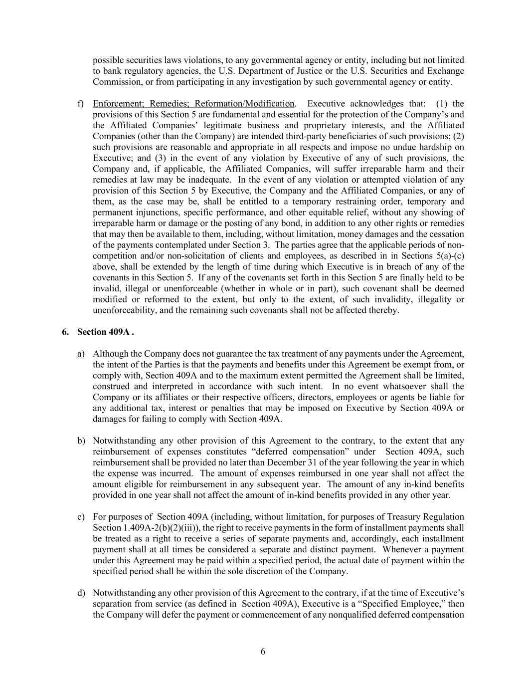 6 possible securities laws violations, to any governmental agency or entity, including but not limited to bank regulatory agencies, the U.S. Department of Justice or the U.S. Securities and Exchange Commission, or from participating in any investigation by such governmental agency or entity. f) Enforcement; Remedies; Reformation/Modification. Executive acknowledges that: (1) the provisions of this Section 5 are fundamental and essential for the protection of the Company’s and the Affiliated Companies’ legitimate business and proprietary interests, and the Affiliated Companies (other than the Company) are intended third-party beneficiaries of such provisions; (2) such provisions are reasonable and appropriate in all respects and impose no undue hardship on Executive; and (3) in the event of any violation by Executive of any of such provisions, the Company and, if applicable, the Affiliated Companies, will suffer irreparable harm and their remedies at law may be inadequate. In the event of any violation or attempted violation of any provision of this Section 5 by Executive, the Company and the Affiliated Companies, or any of them, as the case may be, shall be entitled to a temporary restraining order, temporary and permanent injunctions, specific performance, and other equitable relief, without any showing of irreparable harm or damage or the posting of any bond, in addition to any other rights or remedies that may then be available to them, including, without limitation, money damages and the cessation of the payments contemplated under Section 3. The parties agree that the applicable periods of non- competition and/or non-solicitation of clients and employees, as described in in Sections 5(a)-(c) above, shall be extended by the length of time during which Executive is in breach of any of the covenants in this Section 5. If any of the covenants set forth in this Section 5 are finally held to be invalid, illegal or unenforceable (whether in whole or in part), such covenant shall be deemed modified or reformed to the extent, but only to the extent, of such invalidity, illegality or unenforceability, and the remaining such covenants shall not be affected thereby. 6. Section 409A . a) Although the Company does not guarantee the tax treatment of any payments under the Agreement, the intent of the Parties is that the payments and benefits under this Agreement be exempt from, or comply with, Section 409A and to the maximum extent permitted the Agreement shall be limited, construed and interpreted in accordance with such intent. In no event whatsoever shall the Company or its affiliates or their respective officers, directors, employees or agents be liable for any additional tax, interest or penalties that may be imposed on Executive by Section 409A or damages for failing to comply with Section 409A. b) Notwithstanding any other provision of this Agreement to the contrary, to the extent that any reimbursement of expenses constitutes “deferred compensation” under Section 409A, such reimbursement shall be provided no later than December 31 of the year following the year in which the expense was incurred. The amount of expenses reimbursed in one year shall not affect the amount eligible for reimbursement in any subsequent year. The amount of any in-kind benefits provided in one year shall not affect the amount of in-kind benefits provided in any other year. c) For purposes of Section 409A (including, without limitation, for purposes of Treasury Regulation Section 1.409A-2(b)(2)(iii)), the right to receive payments in the form of installment payments shall be treated as a right to receive a series of separate payments and, accordingly, each installment payment shall at all times be considered a separate and distinct payment. Whenever a payment under this Agreement may be paid within a specified period, the actual date of payment within the specified period shall be within the sole discretion of the Company. d) Notwithstanding any other provision of this Agreement to the contrary, if at the time of Executive’s separation from service (as defined in Section 409A), Executive is a “Specified Employee,” then the Company will defer the payment or commencement of any nonqualified deferred compensation