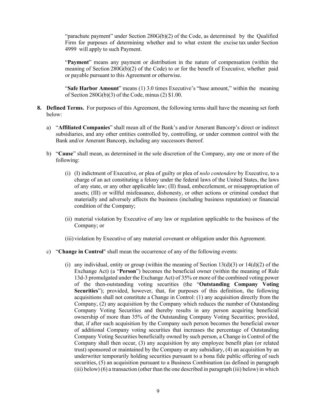 9 “parachute payment” under Section 280G(b)(2) of the Code, as determined by the Qualified Firm for purposes of determining whether and to what extent the excise tax under Section 4999 will apply to such Payment. “Payment” means any payment or distribution in the nature of compensation (within the meaning of Section 280G(b)(2) of the Code) to or for the benefit of Executive, whether paid or payable pursuant to this Agreement or otherwise. “Safe Harbor Amount” means (1) 3.0 times Executive’s “base amount,” within the meaning of Section 280G(b)(3) of the Code, minus (2) $1.00. 8. Defined Terms. For purposes of this Agreement, the following terms shall have the meaning set forth below: a) “Affiliated Companies” shall mean all of the Bank’s and/or Amerant Bancorp’s direct or indirect subsidiaries, and any other entities controlled by, controlling, or under common control with the Bank and/or Amerant Bancorp, including any successors thereof. b) “Cause” shall mean, as determined in the sole discretion of the Company, any one or more of the following: (i) (I) indictment of Executive, or plea of guilty or plea of nolo contendere by Executive, to a charge of an act constituting a felony under the federal laws of the United States, the laws of any state, or any other applicable law; (II) fraud, embezzlement, or misappropriation of assets; (III) or willful misfeasance, dishonesty, or other actions or criminal conduct that materially and adversely affects the business (including business reputation) or financial condition of the Company; (ii) material violation by Executive of any law or regulation applicable to the business of the Company; or (iii) violation by Executive of any material covenant or obligation under this Agreement. c) “Change in Control" shall mean the occurrence of any of the following events: (i) any individual, entity or group (within the meaning of Section 13(d)(3) or 14(d)(2) of the Exchange Act) (a “Person”) becomes the beneficial owner (within the meaning of Rule 13d-3 promulgated under the Exchange Act) of 35% or more of the combined voting power of the then-outstanding voting securities (the “Outstanding Company Voting Securities”); provided, however, that, for purposes of this definition, the following acquisitions shall not constitute a Change in Control: (1) any acquisition directly from the Company, (2) any acquisition by the Company which reduces the number of Outstanding Company Voting Securities and thereby results in any person acquiring beneficial ownership of more than 35% of the Outstanding Company Voting Securities; provided, that, if after such acquisition by the Company such person becomes the beneficial owner of additional Company voting securities that increases the percentage of Outstanding Company Voting Securities beneficially owned by such person, a Change in Control of the Company shall then occur, (3) any acquisition by any employee benefit plan (or related trust) sponsored or maintained by the Company or any subsidiary, (4) an acquisition by an underwriter temporarily holding securities pursuant to a bona fide public offering of such securities, (5) an acquisition pursuant to a Business Combination (as defined in paragraph (iii) below) (6) a transaction (other than the one described in paragraph (iii) below) in which