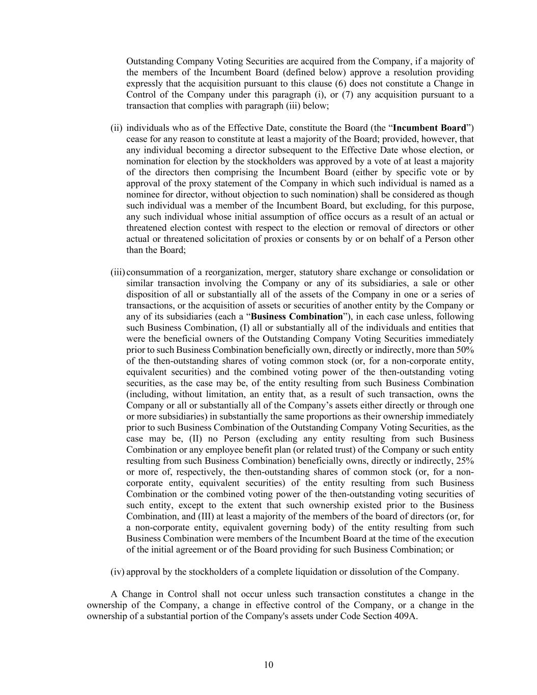 10 Outstanding Company Voting Securities are acquired from the Company, if a majority of the members of the Incumbent Board (defined below) approve a resolution providing expressly that the acquisition pursuant to this clause (6) does not constitute a Change in Control of the Company under this paragraph (i), or (7) any acquisition pursuant to a transaction that complies with paragraph (iii) below; (ii) individuals who as of the Effective Date, constitute the Board (the “Incumbent Board”) cease for any reason to constitute at least a majority of the Board; provided, however, that any individual becoming a director subsequent to the Effective Date whose election, or nomination for election by the stockholders was approved by a vote of at least a majority of the directors then comprising the Incumbent Board (either by specific vote or by approval of the proxy statement of the Company in which such individual is named as a nominee for director, without objection to such nomination) shall be considered as though such individual was a member of the Incumbent Board, but excluding, for this purpose, any such individual whose initial assumption of office occurs as a result of an actual or threatened election contest with respect to the election or removal of directors or other actual or threatened solicitation of proxies or consents by or on behalf of a Person other than the Board; (iii) consummation of a reorganization, merger, statutory share exchange or consolidation or similar transaction involving the Company or any of its subsidiaries, a sale or other disposition of all or substantially all of the assets of the Company in one or a series of transactions, or the acquisition of assets or securities of another entity by the Company or any of its subsidiaries (each a “Business Combination”), in each case unless, following such Business Combination, (I) all or substantially all of the individuals and entities that were the beneficial owners of the Outstanding Company Voting Securities immediately prior to such Business Combination beneficially own, directly or indirectly, more than 50% of the then-outstanding shares of voting common stock (or, for a non-corporate entity, equivalent securities) and the combined voting power of the then-outstanding voting securities, as the case may be, of the entity resulting from such Business Combination (including, without limitation, an entity that, as a result of such transaction, owns the Company or all or substantially all of the Company’s assets either directly or through one or more subsidiaries) in substantially the same proportions as their ownership immediately prior to such Business Combination of the Outstanding Company Voting Securities, as the case may be, (II) no Person (excluding any entity resulting from such Business Combination or any employee benefit plan (or related trust) of the Company or such entity resulting from such Business Combination) beneficially owns, directly or indirectly, 25% or more of, respectively, the then-outstanding shares of common stock (or, for a non- corporate entity, equivalent securities) of the entity resulting from such Business Combination or the combined voting power of the then-outstanding voting securities of such entity, except to the extent that such ownership existed prior to the Business Combination, and (III) at least a majority of the members of the board of directors (or, for a non-corporate entity, equivalent governing body) of the entity resulting from such Business Combination were members of the Incumbent Board at the time of the execution of the initial agreement or of the Board providing for such Business Combination; or (iv) approval by the stockholders of a complete liquidation or dissolution of the Company. A Change in Control shall not occur unless such transaction constitutes a change in the ownership of the Company, a change in effective control of the Company, or a change in the ownership of a substantial portion of the Company's assets under Code Section 409A.