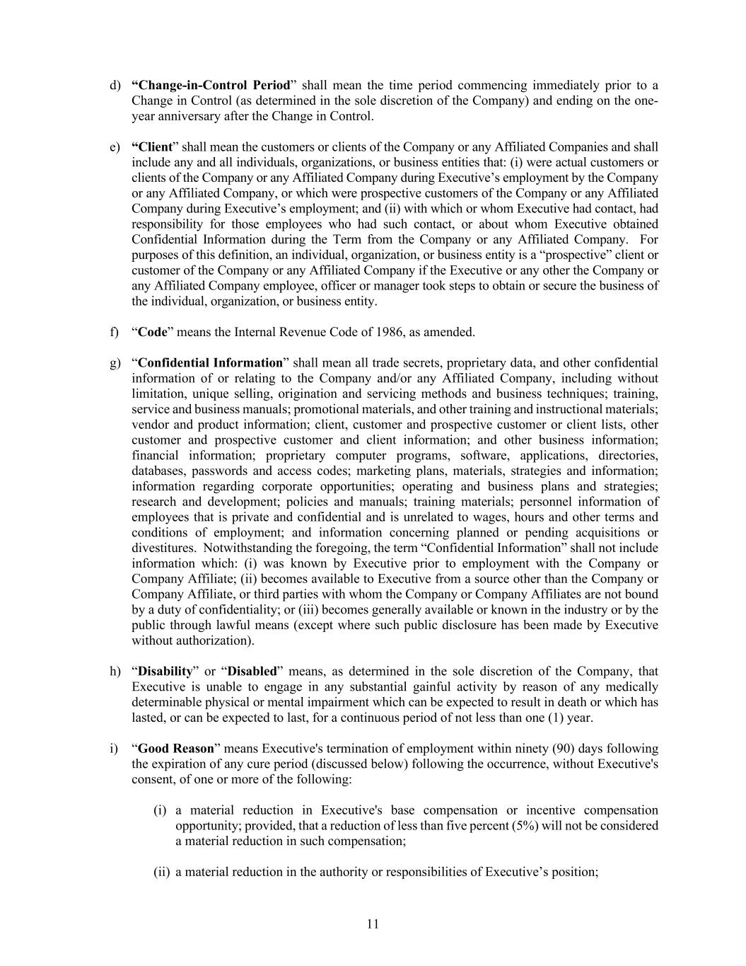 11 d) “Change-in-Control Period” shall mean the time period commencing immediately prior to a Change in Control (as determined in the sole discretion of the Company) and ending on the one- year anniversary after the Change in Control. e) “Client” shall mean the customers or clients of the Company or any Affiliated Companies and shall include any and all individuals, organizations, or business entities that: (i) were actual customers or clients of the Company or any Affiliated Company during Executive’s employment by the Company or any Affiliated Company, or which were prospective customers of the Company or any Affiliated Company during Executive’s employment; and (ii) with which or whom Executive had contact, had responsibility for those employees who had such contact, or about whom Executive obtained Confidential Information during the Term from the Company or any Affiliated Company. For purposes of this definition, an individual, organization, or business entity is a “prospective” client or customer of the Company or any Affiliated Company if the Executive or any other the Company or any Affiliated Company employee, officer or manager took steps to obtain or secure the business of the individual, organization, or business entity. f) “Code” means the Internal Revenue Code of 1986, as amended. g) “Confidential Information” shall mean all trade secrets, proprietary data, and other confidential information of or relating to the Company and/or any Affiliated Company, including without limitation, unique selling, origination and servicing methods and business techniques; training, service and business manuals; promotional materials, and other training and instructional materials; vendor and product information; client, customer and prospective customer or client lists, other customer and prospective customer and client information; and other business information; financial information; proprietary computer programs, software, applications, directories, databases, passwords and access codes; marketing plans, materials, strategies and information; information regarding corporate opportunities; operating and business plans and strategies; research and development; policies and manuals; training materials; personnel information of employees that is private and confidential and is unrelated to wages, hours and other terms and conditions of employment; and information concerning planned or pending acquisitions or divestitures. Notwithstanding the foregoing, the term “Confidential Information” shall not include information which: (i) was known by Executive prior to employment with the Company or Company Affiliate; (ii) becomes available to Executive from a source other than the Company or Company Affiliate, or third parties with whom the Company or Company Affiliates are not bound by a duty of confidentiality; or (iii) becomes generally available or known in the industry or by the public through lawful means (except where such public disclosure has been made by Executive without authorization). h) “Disability” or “Disabled” means, as determined in the sole discretion of the Company, that Executive is unable to engage in any substantial gainful activity by reason of any medically determinable physical or mental impairment which can be expected to result in death or which has lasted, or can be expected to last, for a continuous period of not less than one (1) year. i) “Good Reason” means Executive's termination of employment within ninety (90) days following the expiration of any cure period (discussed below) following the occurrence, without Executive's consent, of one or more of the following: (i) a material reduction in Executive's base compensation or incentive compensation opportunity; provided, that a reduction of less than five percent (5%) will not be considered a material reduction in such compensation; (ii) a material reduction in the authority or responsibilities of Executive’s position;