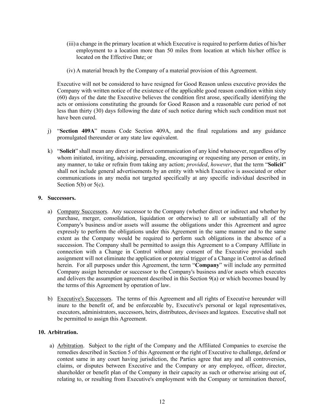 12 (iii) a change in the primary location at which Executive is required to perform duties of his/her employment to a location more than 50 miles from location at which his/her office is located on the Effective Date; or (iv) A material breach by the Company of a material provision of this Agreement. Executive will not be considered to have resigned for Good Reason unless executive provides the Company with written notice of the existence of the applicable good reason condition within sixty (60) days of the date the Executive believes the condition first arose, specifically identifying the acts or omissions constituting the grounds for Good Reason and a reasonable cure period of not less than thirty (30) days following the date of such notice during which such condition must not have been cured. j) “Section 409A” means Code Section 409A, and the final regulations and any guidance promulgated thereunder or any state law equivalent. k) “Solicit” shall mean any direct or indirect communication of any kind whatsoever, regardless of by whom initiated, inviting, advising, persuading, encouraging or requesting any person or entity, in any manner, to take or refrain from taking any action; provided, however, that the term “Solicit” shall not include general advertisements by an entity with which Executive is associated or other communications in any media not targeted specifically at any specific individual described in Section 5(b) or 5(c). 9. Successors. a) Company Successors. Any successor to the Company (whether direct or indirect and whether by purchase, merger, consolidation, liquidation or otherwise) to all or substantially all of the Company's business and/or assets will assume the obligations under this Agreement and agree expressly to perform the obligations under this Agreement in the same manner and to the same extent as the Company would be required to perform such obligations in the absence of a succession. The Company shall be permitted to assign this Agreement to a Company Affiliate in connection with a Change in Control without any consent of the Executive provided such assignment will not eliminate the application or potential trigger of a Change in Control as defined herein. For all purposes under this Agreement, the term “Company” will include any permitted Company assign hereunder or successor to the Company's business and/or assets which executes and delivers the assumption agreement described in this Section 9(a) or which becomes bound by the terms of this Agreement by operation of law. b) Executive's Successors. The terms of this Agreement and all rights of Executive hereunder will inure to the benefit of, and be enforceable by, Executive's personal or legal representatives, executors, administrators, successors, heirs, distributees, devisees and legatees. Executive shall not be permitted to assign this Agreement. 10. Arbitration. a) Arbitration. Subject to the right of the Company and the Affiliated Companies to exercise the remedies described in Section 5 of this Agreement or the right of Executive to challenge, defend or contest same in any court having jurisdiction, the Parties agree that any and all controversies, claims, or disputes between Executive and the Company or any employee, officer, director, shareholder or benefit plan of the Company in their capacity as such or otherwise arising out of, relating to, or resulting from Executive's employment with the Company or termination thereof,