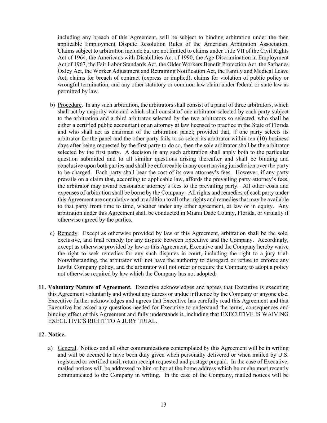 13 including any breach of this Agreement, will be subject to binding arbitration under the then applicable Employment Dispute Resolution Rules of the American Arbitration Association. Claims subject to arbitration include but are not limited to claims under Title VII of the Civil Rights Act of 1964, the Americans with Disabilities Act of 1990, the Age Discrimination in Employment Act of 1967, the Fair Labor Standards Act, the Older Workers Benefit Protection Act, the Sarbanes Oxley Act, the Worker Adjustment and Retraining Notification Act, the Family and Medical Leave Act, claims for breach of contract (express or implied), claims for violation of public policy or wrongful termination, and any other statutory or common law claim under federal or state law as permitted by law. b) Procedure. In any such arbitration, the arbitrators shall consist of a panel of three arbitrators, which shall act by majority vote and which shall consist of one arbitrator selected by each party subject to the arbitration and a third arbitrator selected by the two arbitrators so selected, who shall be either a certified public accountant or an attorney at law licensed to practice in the State of Florida and who shall act as chairman of the arbitration panel; provided that, if one party selects its arbitrator for the panel and the other party fails to so select its arbitrator within ten (10) business days after being requested by the first party to do so, then the sole arbitrator shall be the arbitrator selected by the first party. A decision in any such arbitration shall apply both to the particular question submitted and to all similar questions arising thereafter and shall be binding and conclusive upon both parties and shall be enforceable in any court having jurisdiction over the party to be charged. Each party shall bear the cost of its own attorney’s fees. However, if any party prevails on a claim that, according to applicable law, affords the prevailing party attorney’s fees, the arbitrator may award reasonable attorney’s fees to the prevailing party. All other costs and expenses of arbitration shall be borne by the Company. All rights and remedies of each party under this Agreement are cumulative and in addition to all other rights and remedies that may be available to that party from time to time, whether under any other agreement, at law or in equity. Any arbitration under this Agreement shall be conducted in Miami Dade County, Florida, or virtually if otherwise agreed by the parties. c) Remedy. Except as otherwise provided by law or this Agreement, arbitration shall be the sole, exclusive, and final remedy for any dispute between Executive and the Company. Accordingly, except as otherwise provided by law or this Agreement, Executive and the Company hereby waive the right to seek remedies for any such disputes in court, including the right to a jury trial. Notwithstanding, the arbitrator will not have the authority to disregard or refuse to enforce any lawful Company policy, and the arbitrator will not order or require the Company to adopt a policy not otherwise required by law which the Company has not adopted. 11. Voluntary Nature of Agreement. Executive acknowledges and agrees that Executive is executing this Agreement voluntarily and without any duress or undue influence by the Company or anyone else. Executive further acknowledges and agrees that Executive has carefully read this Agreement and that Executive has asked any questions needed for Executive to understand the terms, consequences and binding effect of this Agreement and fully understands it, including that EXECUTIVE IS WAIVING EXECUTIVE’S RIGHT TO A JURY TRIAL. 12. Notice. a) General. Notices and all other communications contemplated by this Agreement will be in writing and will be deemed to have been duly given when personally delivered or when mailed by U.S. registered or certified mail, return receipt requested and postage prepaid. In the case of Executive, mailed notices will be addressed to him or her at the home address which he or she most recently communicated to the Company in writing. In the case of the Company, mailed notices will be