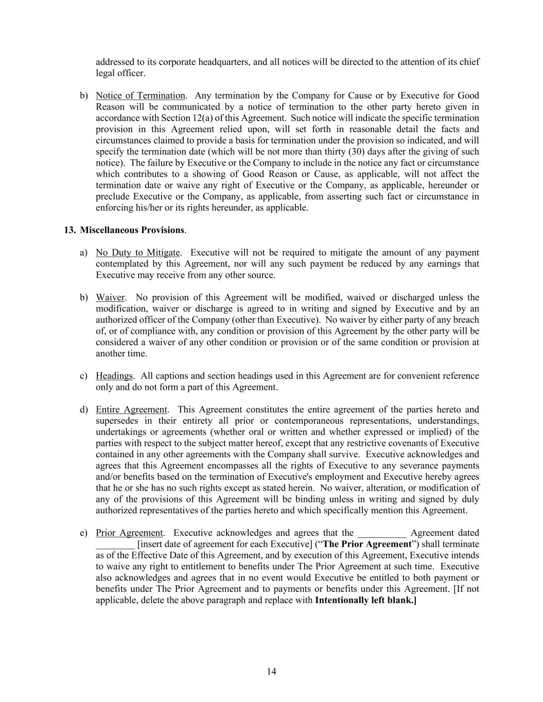 14 addressed to its corporate headquarters, and all notices will be directed to the attention of its chief legal officer. b) Notice of Termination. Any termination by the Company for Cause or by Executive for Good Reason will be communicated by a notice of termination to the other party hereto given in accordance with Section 12(a) of this Agreement. Such notice will indicate the specific termination provision in this Agreement relied upon, will set forth in reasonable detail the facts and circumstances claimed to provide a basis for termination under the provision so indicated, and will specify the termination date (which will be not more than thirty (30) days after the giving of such notice). The failure by Executive or the Company to include in the notice any fact or circumstance which contributes to a showing of Good Reason or Cause, as applicable, will not affect the termination date or waive any right of Executive or the Company, as applicable, hereunder or preclude Executive or the Company, as applicable, from asserting such fact or circumstance in enforcing his/her or its rights hereunder, as applicable. 13. Miscellaneous Provisions. a) No Duty to Mitigate. Executive will not be required to mitigate the amount of any payment contemplated by this Agreement, nor will any such payment be reduced by any earnings that Executive may receive from any other source. b) Waiver. No provision of this Agreement will be modified, waived or discharged unless the modification, waiver or discharge is agreed to in writing and signed by Executive and by an authorized officer of the Company (other than Executive). No waiver by either party of any breach of, or of compliance with, any condition or provision of this Agreement by the other party will be considered a waiver of any other condition or provision or of the same condition or provision at another time. c) Headings. All captions and section headings used in this Agreement are for convenient reference only and do not form a part of this Agreement. d) Entire Agreement. This Agreement constitutes the entire agreement of the parties hereto and supersedes in their entirety all prior or contemporaneous representations, understandings, undertakings or agreements (whether oral or written and whether expressed or implied) of the parties with respect to the subject matter hereof, except that any restrictive covenants of Executive contained in any other agreements with the Company shall survive. Executive acknowledges and agrees that this Agreement encompasses all the rights of Executive to any severance payments and/or benefits based on the termination of Executive's employment and Executive hereby agrees that he or she has no such rights except as stated herein. No waiver, alteration, or modification of any of the provisions of this Agreement will be binding unless in writing and signed by duly authorized representatives of the parties hereto and which specifically mention this Agreement. e) Prior Agreement. Executive acknowledges and agrees that the __________ Agreement dated ________ [insert date of agreement for each Executive] (“The Prior Agreement”) shall terminate as of the Effective Date of this Agreement, and by execution of this Agreement, Executive intends to waive any right to entitlement to benefits under The Prior Agreement at such time. Executive also acknowledges and agrees that in no event would Executive be entitled to both payment or benefits under The Prior Agreement and to payments or benefits under this Agreement. [If not applicable, delete the above paragraph and replace with Intentionally left blank.]