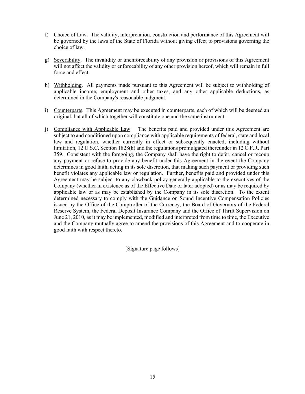 15 f) Choice of Law. The validity, interpretation, construction and performance of this Agreement will be governed by the laws of the State of Florida without giving effect to provisions governing the choice of law. g) Severability. The invalidity or unenforceability of any provision or provisions of this Agreement will not affect the validity or enforceability of any other provision hereof, which will remain in full force and effect. h) Withholding. All payments made pursuant to this Agreement will be subject to withholding of applicable income, employment and other taxes, and any other applicable deductions, as determined in the Company's reasonable judgment. i) Counterparts. This Agreement may be executed in counterparts, each of which will be deemed an original, but all of which together will constitute one and the same instrument. j) Compliance with Applicable Law. The benefits paid and provided under this Agreement are subject to and conditioned upon compliance with applicable requirements of federal, state and local law and regulation, whether currently in effect or subsequently enacted, including without limitation, 12 U.S.C. Section 1828(k) and the regulations promulgated thereunder in 12 C.F.R. Part 359. Consistent with the foregoing, the Company shall have the right to defer, cancel or recoup any payment or refuse to provide any benefit under this Agreement in the event the Company determines in good faith, acting in its sole discretion, that making such payment or providing such benefit violates any applicable law or regulation. Further, benefits paid and provided under this Agreement may be subject to any clawback policy generally applicable to the executives of the Company (whether in existence as of the Effective Date or later adopted) or as may be required by applicable law or as may be established by the Company in its sole discretion. To the extent determined necessary to comply with the Guidance on Sound Incentive Compensation Policies issued by the Office of the Comptroller of the Currency, the Board of Governors of the Federal Reserve System, the Federal Deposit Insurance Company and the Office of Thrift Supervision on June 21, 2010, as it may be implemented, modified and interpreted from time to time, the Executive and the Company mutually agree to amend the provisions of this Agreement and to cooperate in good faith with respect thereto. [Signature page follows]